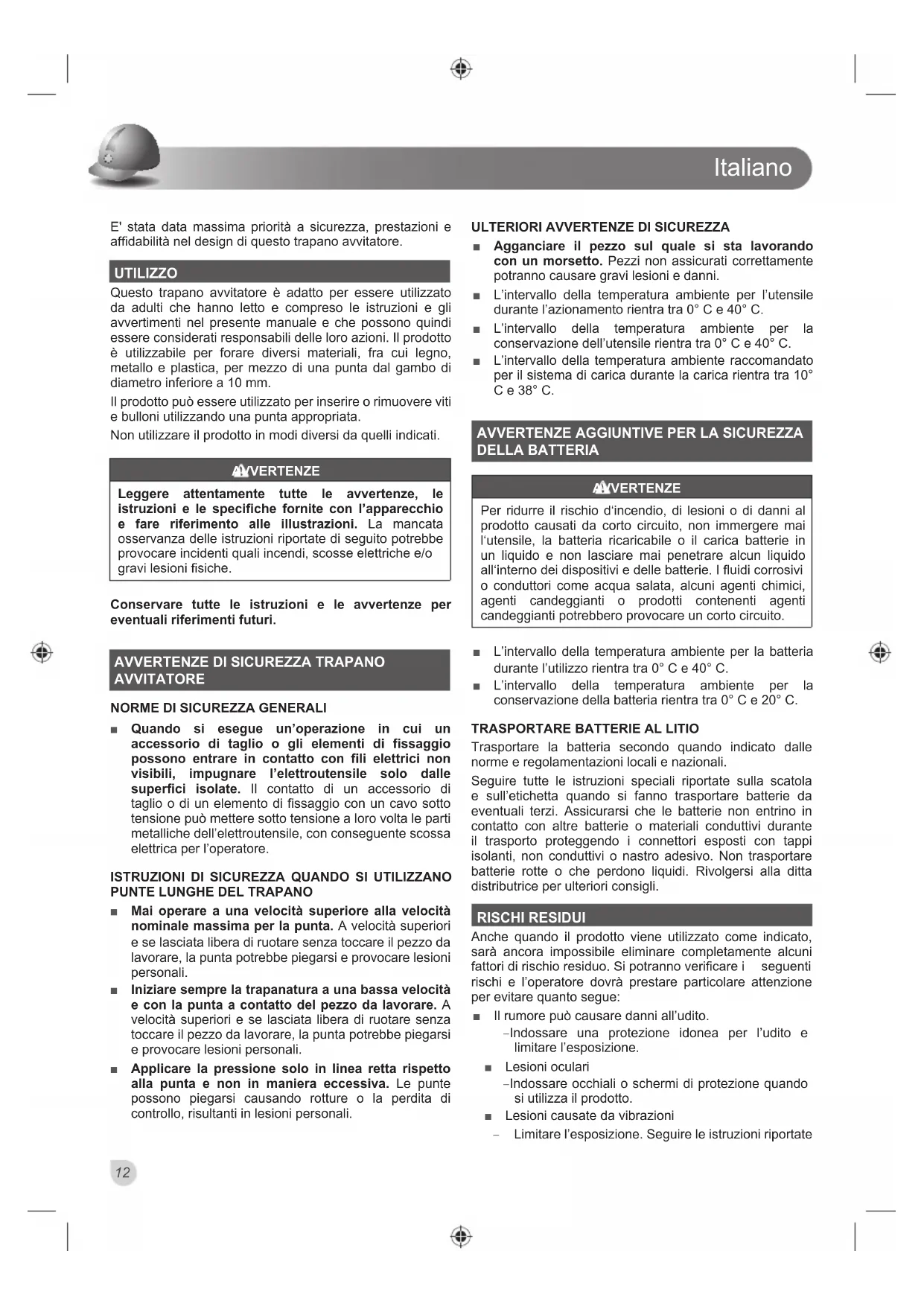 E' stata data massima priorità a sicurezza, prestazioni e DI¿GDELOLWjQHOGHVLJQGLTXHVWRWUDSDQRDYYLWDWRUH UTILIZZO Questo trapano avvitatore è adatto per essere utilizzato da adulti che hanno letto e compreso le istruzioni e gli avvertimenti nel presente manuale e che possono quindi essere considerati responsabili delle loro azioni. Il prodotto è utilizzabile per forare diversi materiali, fra cui legno, metallo e plastica, per mezzo di una punta dal gambo di diametro inferiore a 10 mm. Il prodotto può essere utilizzato per inserire o rimuovere viti e bulloni utilizzando una punta appropriata. Non utilizzare il prodotto in modi diversi da quelli indicati. AVVERTENZE Leggere attentamente tutte le avvertenze, le istruzioni e le specifiche fornite con l’apparecchio e fare riferimento alle illustrazioni. La mancata osservanza delle istruzioni riportate di seguito potrebbe SURYRFDUHLQFLGHQWLTXDOLLQFHQGLVFRVVHHOHWWULFKHHR JUDYLOHVLRQL¿VLFKH Conservare tutte le istruzioni e le avvertenze per eventuali riferimenti futuri.