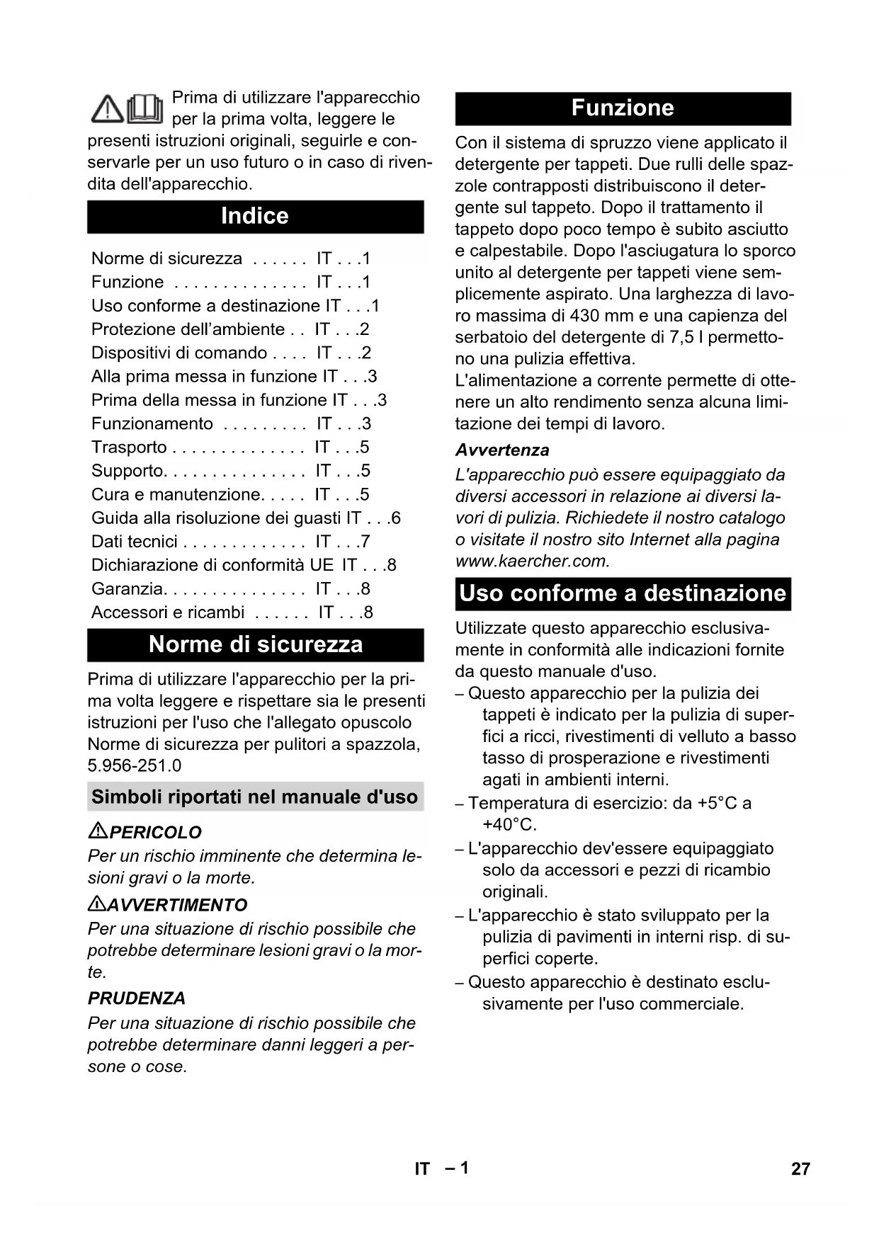 - Chairman of the Board of Management Director Regulatory Affairs & Certification Garantie Accessoires et pièces de rechange 26 FR– 1 Prima di utilizzare l'apparecchio per la prima volta, leggere le presenti istruzioni originali, seguirle e con- servarle per un uso futuro o in caso di riven- dita dell'apparecchio. Prima di utilizzare l'apparecchio per la pri- ma volta leggere e rispettare sia le presenti istruzioni per l'uso che l'allegato opuscolo Norme di sicurezza per pulitori a spazzola, 5.956-251.0 PERICOLO Per un rischio imminente che determina le- sioni gravi o la morte. 몇 AVVERTIMENTO Per una situazione di rischio possibile che potrebbe determinare lesioni gravi o la mor- te. PRUDENZA Per una situazione di rischio possibile che potrebbe determinare danni leggeri a per- sone o cose. Con il sistema di spruzzo viene applicato il detergente per tappeti. Due rulli delle spaz- zole contrapposti distribuiscono il deter- gente sul tappeto. Dopo il trattamento il tappeto dopo poco tempo è subito asciutto e calpestabile. Dopo l'asciugatura lo sporco unito al detergente per tappeti viene sem- plicemente aspirato. Una larghezza di lavo- ro massima di 430 mm e una capienza del serbatoio del detergente di 7,5 l permetto- no una pulizia effettiva. L'alimentazione a corrente permette di otte- nere un alto rendimento senza alcuna limi- tazione dei tempi di lavoro. Avvertenza L'apparecchio può essere equipaggiato da diversi accessori in relazione ai diversi la- vori di pulizia. Richiedete il nostro catalogo o visitate il nostro sito Internet alla pagina www.kaercher.com. Utilizzate questo apparecchio esclusiva- mente in conformità alle indicazioni fornite da questo manuale d'uso. – Questo apparecchio per la pulizia dei tappeti è indicato per la pulizia di super- fici a ricci, rivestimenti di velluto a basso tasso di prosperazione e rivestimenti agati in ambienti interni. – Temperatura di esercizio: da +5°C a +40°C. – L'apparecchio dev'essere equipaggiato solo da accessori e pezzi di ricambio originali. – L'apparecchio è stato sviluppato per la pulizia di pavimenti in interni risp. di su- perfici coperte. – Questo apparecchio è destinato esclu- sivamente per l'uso commerciale. Indice Norme di sicurezza