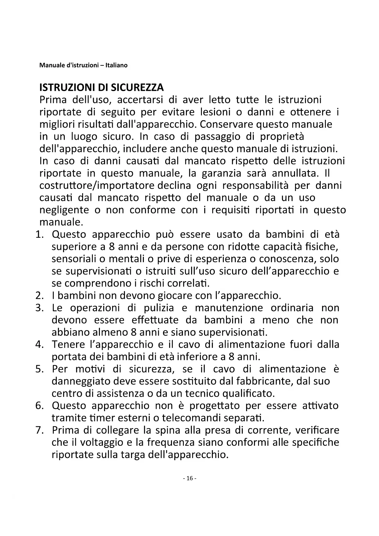 Prima dell'uso, accertarsi di aver letto tutte le istruzioni riportate di seguito per evitare lesioni o danni e ottenere i migliori risultati dall'apparecchio. Conservare questo manuale in un luogo sicuro. In caso di passaggio di proprietà dell'apparecchio, includere anche questo manuale di istruzioni. In caso di danni causati dal mancato rispetto delle istruzioni riportate in questo manuale, la garanzia sarà annullata. Il costruttore/importatore declina ogni responsabilità per danni causati dal mancato rispetto del manuale o da un uso negligente o non conforme con i requisiti riportati in questo manuale.