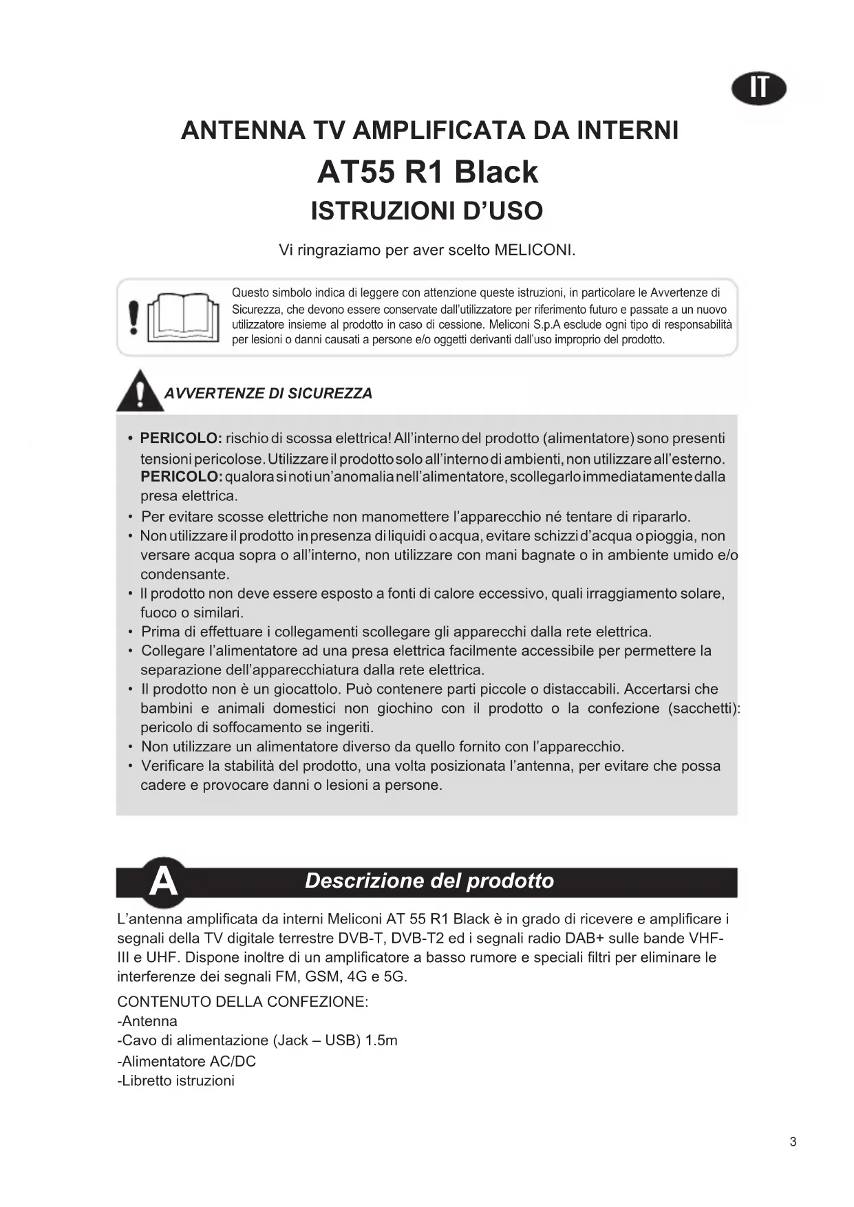 Vi ringraziamo per aver scelto MELICONI. L’antenna amplicata da interni Meliconi AT 55 R1 Black è in grado di ricevere e amplicare i segnali della TV digitale terrestre DVB-T, DVB-T2 ed i segnali radio DAB+ sulle bande VHF-III e UHF. Dispone inoltre di un amplicatore a basso rumore e speciali ltri per eliminare le interferenze dei segnali FM, GSM, 4G e 5G.CONTENUTO DELLA CONFEZIONE:-Antenna -Cavo di alimentazione (Jack – USB) 1.5m-Alimentatore AC/DC -Libretto istruzioni