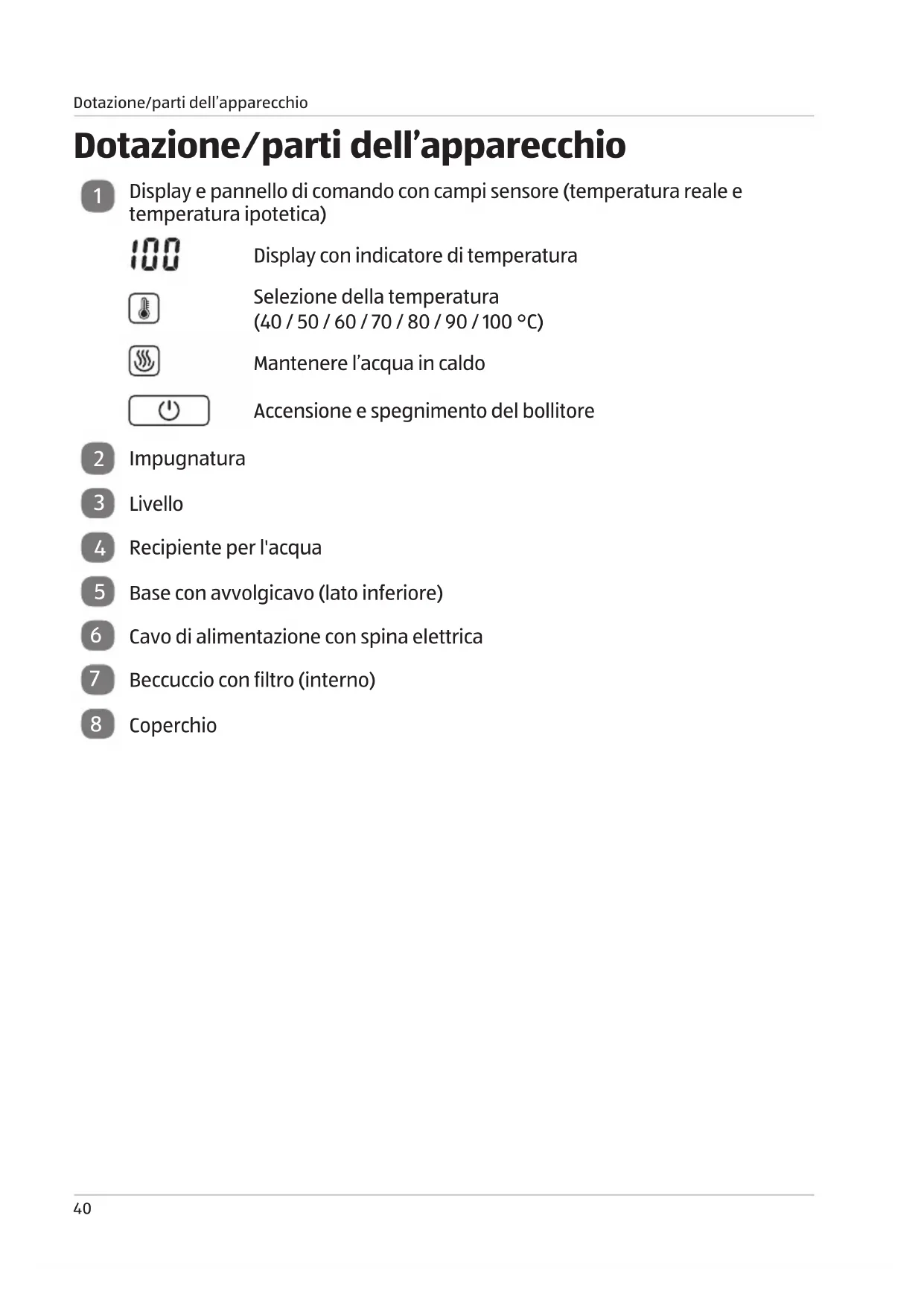 Display e pannello di comando con campi sensore (temperatura reale e temperatura ipotetica) Display con indicatore di temperatura Selezione della temperatura (40 / 50 / 60 / 70 / 80 / 90 / 100 °C) Mantenere l’acqua in caldo Accensione e spegnimento del bollitore