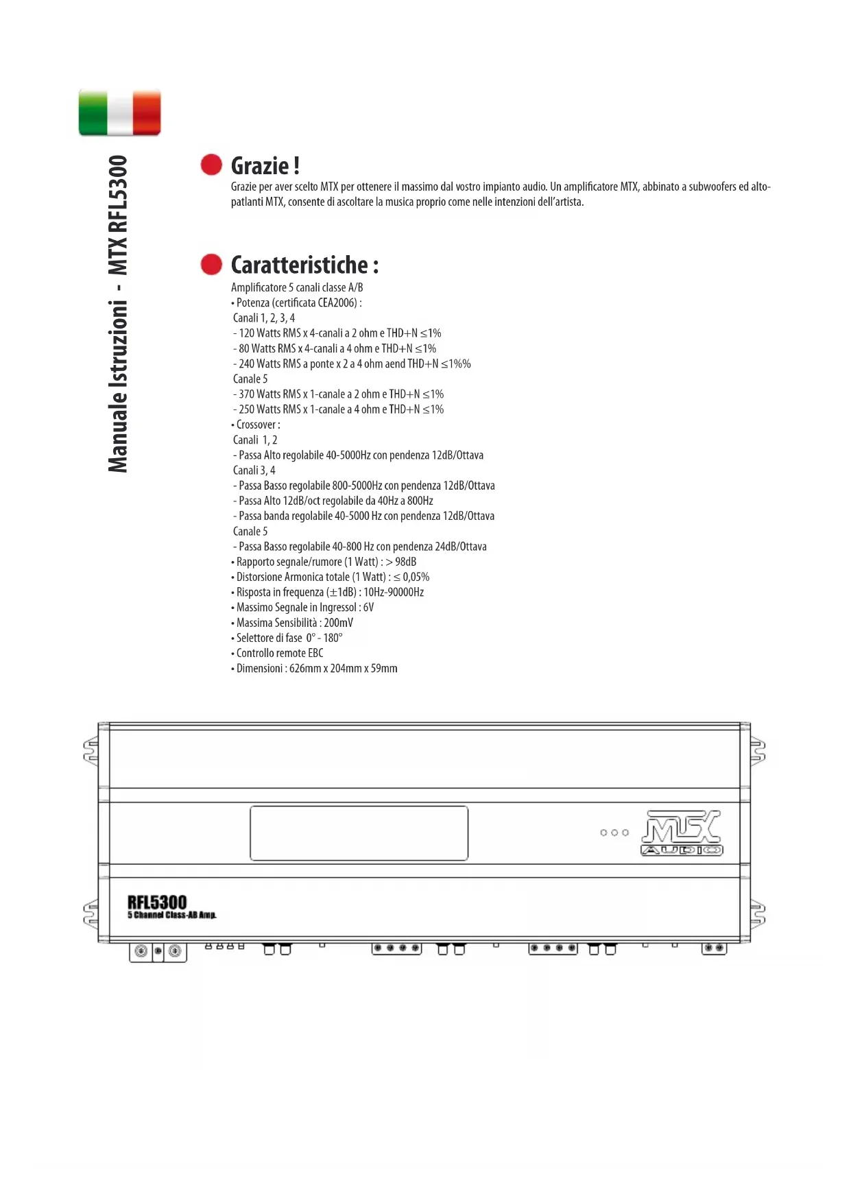 2. Scegli il punto giusto per installare l’amplificatore assicurandoti che un adeguato flusso d’aria possa raffreddare il dissipatore. Prima di effettuare fori sulla vettura assicurati di non interferire con con cavi, circuiti, serbatoio ecc. 3. Posiziona un cavo di alimentazione che possa collegare il terminale(+) della batteria al terminale +BATT dell’amplificatore. Per il momento, non collegare il cavo al terminale positivo (+) della batteria. Nota: usa cavi di sezione adeguata e dello stesso diametro per l’alimentazione e per la massa. 4. Installa un fusibile di linea entro ad una distanza non superiore a 20 cm. Dalla batteria: ciò riduce realmente il rischio di dannio al veicolo in caso di corto circuito o incidente. Assicurati che il abbassa realmente 5. Trova un buon punto di massa sullo chassis del veicolo e rimuovi la vernice mettendo a nudo il metallo. Collega a questo punto un capo del cavo di massa e l’altro capo al terminale GND dell’amplificatore.Installazione e Montaggio : 6. Collega un cavo di accensione dalla sorgente all terminale Remote dell’amplificatore.Se la sorgente non ha un cavo dedicato alla accensione puoi connetterti al cavo antenna della sorgente. 7. Collega i cavi RCA dalla sorgente ai connettori RCA dell’amplificatore. Posiziona i cavi di segnale lontano dai cavi di alimentazione. <Usa cavi di segnale di alta qualità per diminuire la possibilità di disturbi nel sistema. 8. Collega gli altoparlanti all’amplificatore con cavi di sezione adeguata. Le coppie di canali 1/2 e 3/4 a ponte possono pilotare carichi non inferiori a 4 Ohm. Il canale mono (5) può pilotare carichi non inferiori a 2 Ohm 9. Controlla almeno due volte tutti i passaggi della installazione, in particolare le connessioni. Se è tutto corretto, ricollega il cavo di massa, sistema il fusibile nel portafusibile di linea e inizia a settare l’amplificatore. Nota : assicurati che il Gain sia tutto girato in senso anti orario prima di procedere al settaggio. Ricerca delle Anomalie : Problema Causa Soluzione Nessuna Indicazione dai Led Manca l’alimentazione alla connessione remote Dai corrente al cavo remote Niente alimentazione al connettore positivo Dai alimentazione al positivo batteria Connessione di massa insufficiente Verifica le connessioni di massa Fusibile di alimentazione bruciato Sostituire il fusibile Led acceso ma niente segnale Volume basso della sorgente Aumenta il volume Connessione altoparlanti non effettuate Effettua le connessioni altoparlanti Gain sull’amplificatore al minimo Accendi nuovamente Controllo spegnale inattivo Alimenta il processore di segnale Tutti gli altoparlanti bruciati Sostituisci gli altoparlanti Riproduzione distorta Volume della sorgente troppo alto Volume della sorgente basso Gain dell’amplificatore troppo alto Gain dell’amplificatore basso Bilanciamento al contrario Collegamento altoparlanti Ch1+Ch2 invertito Collega gli altoparlanti Collegamento altoparlanti Ch3+Ch4 invertito correttamente Collegamento RCA in ingresso invertito Inverti il collegamento Bassi deboli Altoparlanti collegati in controfase. Collega gli altoparlanti correttamente Non stai usando un subwoofer MTX Compra un subwoofer MTX Fusibili bruciati Livelli di uscita troppo elevati Abbassa il volume Amplificatore difettoso Spedire il prodotto in assistenza Come rimanere sintonizzati : https://www.facebook.com/MTXEurope https://twitter.com/MTXEurope http://www.mtxaudio.euManual de Utilizador - MTX RFL5300 Obrigado ! Obrigado por escolher MTX. Uma instalação correcta do amplificador em conjugação com altifalantes e subwoofers MTX, proporciona um som e performance superiores para horas infinitas a “acordar” os seus vizinhos ou a divertir-se com os seus amigos. Parabéns e divirta-se a experimentar a última novidade em audio da MTX! Especificações :