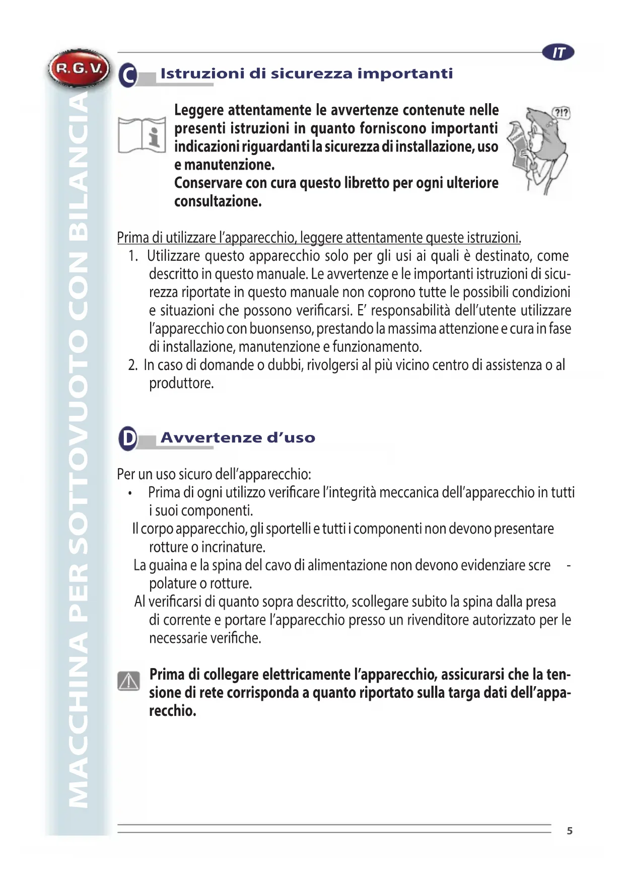 Scarica le istruzioni per il tuo Macchine per confezionamento sottovuoto in formato PDF gratuitamente! Trova il tuo manuale Smart SB300 - RGV e riprendi in mano il tuo dispositivo elettronico. In questa pagina sono pubblicati tutti i documenti necessari per l'utilizzo del tuo dispositivo. Smart SB300 del marchio RGV.