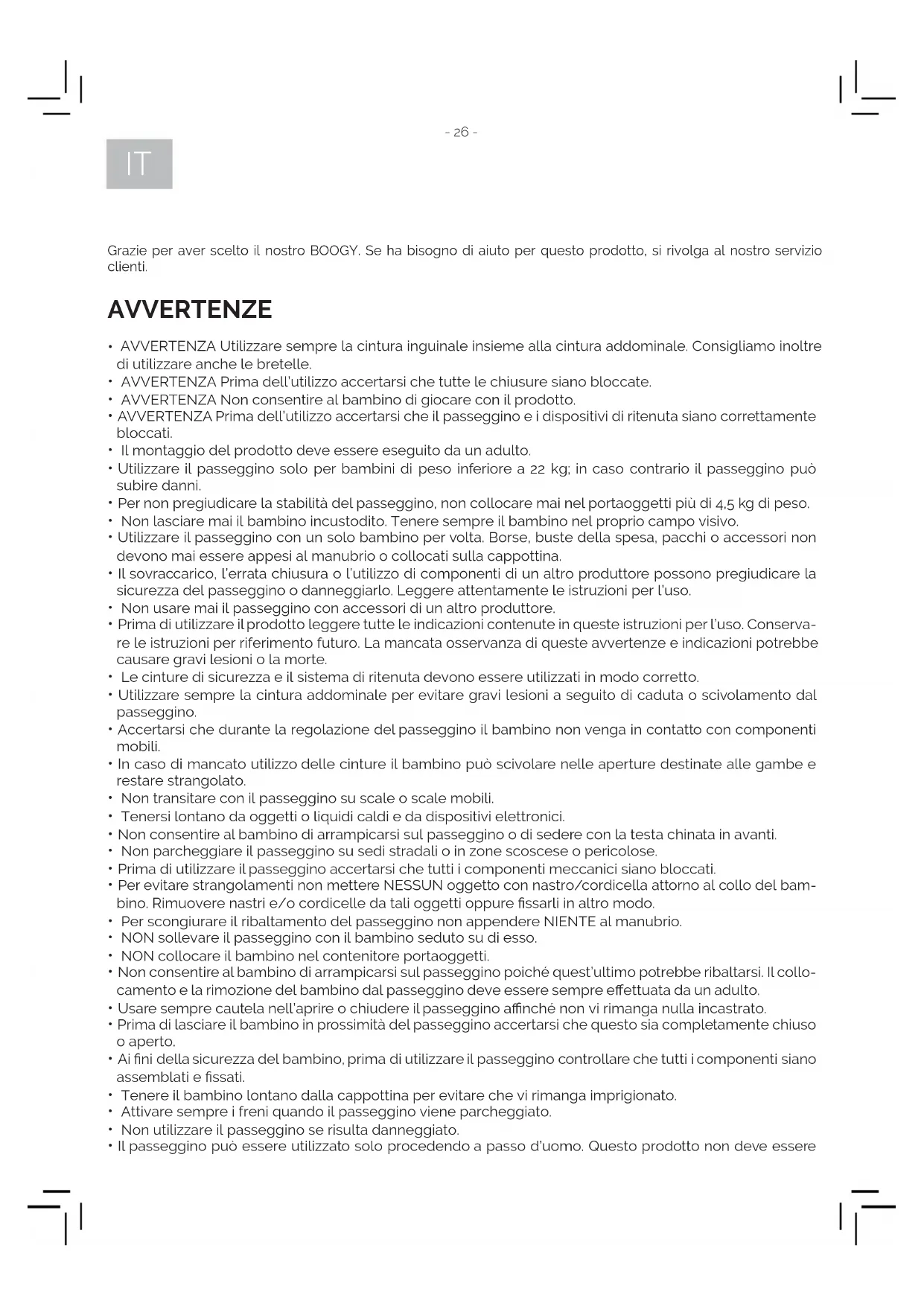 - Il passeggino può essere utilizzato solo procedendo a passo d’uomo. Questo prodotto non deve essere IT- 27 - usato per il jogging.