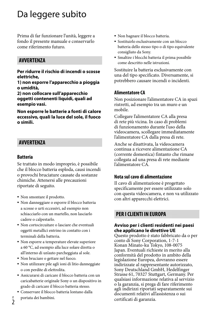 Avviso per i clienti residenti nei paesi che applicano le direttive UE Questo prodotto è stato fabbricato da o per conto di Sony Corporation, 1-7-1 Konan Minato-ku Tokyo, 108-0075 Japan. Eventuali richieste in merito alla conformità del prodotto in ambito della legislazione Europea, dovranno essere indirizzate al rappresentante autorizzato, Sony Deutschland GmbH, Hedelfinger Strasse 61, 70327 Stuttgart, Germany. Per qualsiasi informazione relativa al servizio o la garanzia, si prega di fare riferimento agli indirizzi riportati separatamente sui documenti relativi all’assistenza o sui certificati di garanzia. Questo prodotto è stato testato ed è risultato conforme ai limiti stabiliti nella regolazione EMC relativa all’uso dei cavi di collegamento di lunghezza inferiore a 3 metri. Attenzione Il campo elettromagnetico alle frequenze specifiche può influenzare l’immagine e il suono di questa unità. Nota Se l’elettricità statica o interferenze elettromagnetiche causano l’interruzione del trasferimento dei dati, che pertanto non avviene, è necessario riavviare l’applicazione oppure scollegare, quindi ricollegare il cavo di comunicazione (USB e così via). Trattamento del dispositivo elettrico o elettronico a fine vita (applicabile in tutti i paesi dell’Unione Europea e in altri paesi europei con sistema di raccolta differenziata) Questo simbolo sul prodotto o sulla confezione indica che il prodotto non deve essere considerato come un normale rifiuto domestico, ma deve invece essere consegnato ad un punto di raccolta appropriato per il riciclo di apparecchi elettrici ed elettronici. Assicurandovi che questo prodotto sia smaltito correttamente, voi contribuirete a prevenire potenziali conseguenze negative per l’ambiente e per la salute che potrebbero altrimenti essere causate dal suo smaltimento inadeguato. Il riciclaggio dei materiali aiuta a conservare le risorse naturali. Per informazioni più dettagliate circa il riciclaggio di questo prodotto, potete contattare l’ufficio comunale, il servizio locale di smaltimento rifiuti oppure il negozio dove l’avete acquistato. In caso di smaltimento abusivo di apparecchiature elettriche e/o elettroniche potrebbero essere applicate le sanzioni previste dalla normativa applicabile (valido solo per l’Italia). Trattamento delle pile esauste (applicabile in tutti i paesi dell’Unione Europea e in altri paesi Europei con sistema di raccolta differenziata) Questo simbolo sul prodotto o sulla confezione indica che la pila non deve essere considerata un normale rifiuto domestico. Su alcuni tipi di pile questo simbolo potrebbe essere utilizzato in combinazione con un simbolo chimico. I simboli chimici del mercurio (Hg) o del piombo (Pb) sono aggiunti, se la batteria contiene più dello 0,0005% di mercurio o dello 0,004% di piombo. Assicurandovi che le pile siano smaltite correttamente, contribuirete a prevenire potenziali conseguenze negative per l’ambiente e per la salute che potrebbero altrimenti essere causate dal loro inadeguato smaltimento. Il riciclaggio dei materiali aiuta a conservare le risorse naturali. In caso di prodotti che per motivi di sicurezza, prestazione o protezione dei dati richiedano un collegamento fisso ad una pila interna, la stessa dovrà essere sostituita solo da personale di assistenza qualificato. Consegnare il prodotto a fine vita al punto di raccolta idoneo allo smaltimento di apparecchiature elettriche ed elettroniche; questo assicura che anche la pila al suo interno venga trattata correttamente. Per le altre pile consultate la sezione relativa alla rimozione sicura delle pile. Conferire le pile esauste presso i punti di raccolta indicati per il riciclo. Per informazioni più dettagliate circa lo smaltimento della pila esausta o del prodotto, potete contattare il Comune, il servizio locale di smaltimento rifiuti oppure il negozio dove l’avete acquistato.