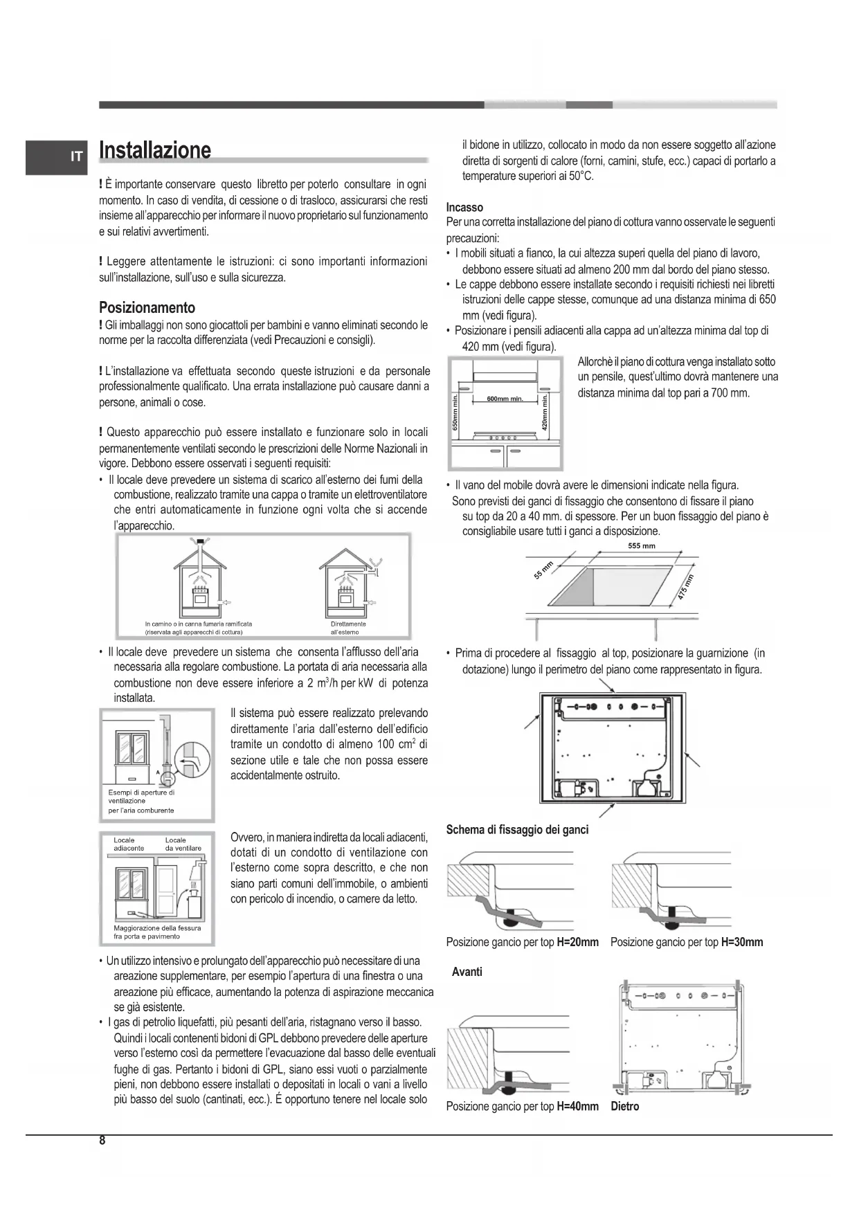 Installazione ! È importante conservare questo libretto per poterlo consultare in ogni momento. In caso di vendita, di cessione o di trasloco, assicurarsi che resti insieme all’apparecchio per informare il nuovo proprietario sul funzionamento e sui relativi avvertimenti. ! Leggere attentamente le istruzioni: ci sono importanti informazioni sull’installazione, sull’uso e sulla sicurezza. Posizionamento ! Gli imballaggi non sono giocattoli per bambini e vanno eliminati secondo le norme per la raccolta differenziata (vedi Precauzioni e consigli). ! L’installazione va effettuata secondo queste istruzioni e da personale professionalmente qualicato. Una errata installazione può causare danni a persone, animali o cose. ! Questo apparecchio può essere installato e funzionare solo in locali permanentemente ventilati secondo le prescrizioni delle Norme Nazionali in vigore. Debbono essere osservati i seguenti requisiti: