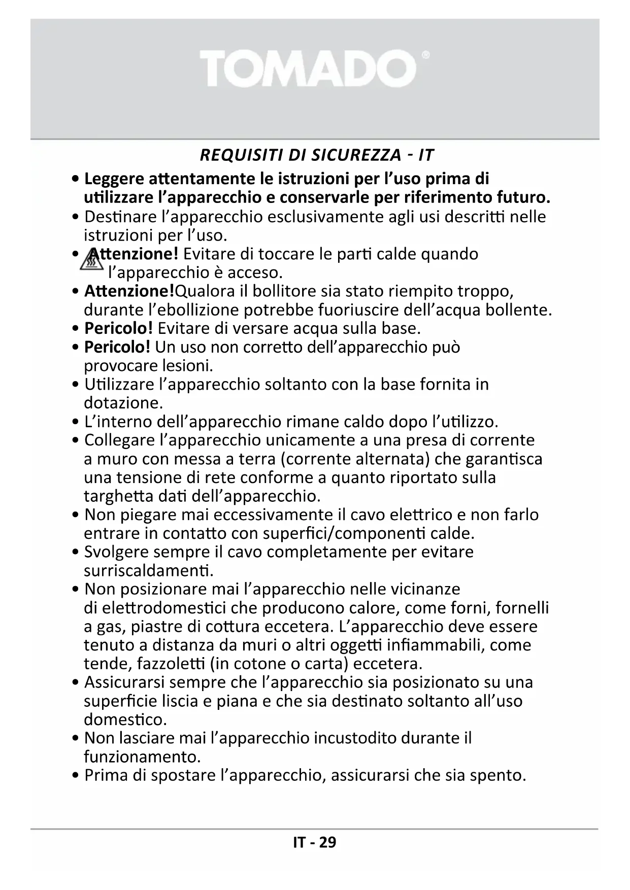 Scarica le istruzioni per il tuo Bollitore in formato PDF gratuitamente! Trova il tuo manuale TWK1703G - Tomado e riprendi in mano il tuo dispositivo elettronico. In questa pagina sono pubblicati tutti i documenti necessari per l'utilizzo del tuo dispositivo. TWK1703G del marchio Tomado.