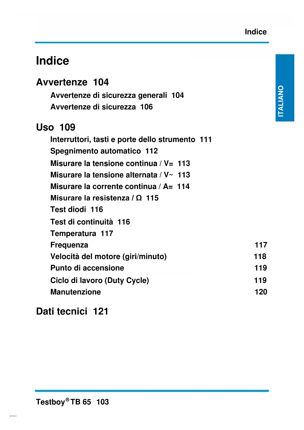 TB 65 103 ITALIANO ITALIANO ITALIANO ITALIANO Indice Avvertenze 104 Avvertenze di sicurezza generali 104 Avvertenze di sicurezza 106 Uso 109 Interruttori, tasti e porte dello strumento 111 Spegnimento automatico 112 Misurare la tensione continua / V= 113 Misurare la tensione alternata / V~ 113 Misurare la corrente continua / A= 114 Misurare la resistenza / Ω 115 Test diodi 116 Test di continuità 116 Temperatura 117 Frequenza 117 Velocità del motore (giri/minuto) 118 Punto di accensione 119 Ciclo di lavoro (Duty Cycle) 119 Manutenzione 120 Dati tecnici 121Avvertenze