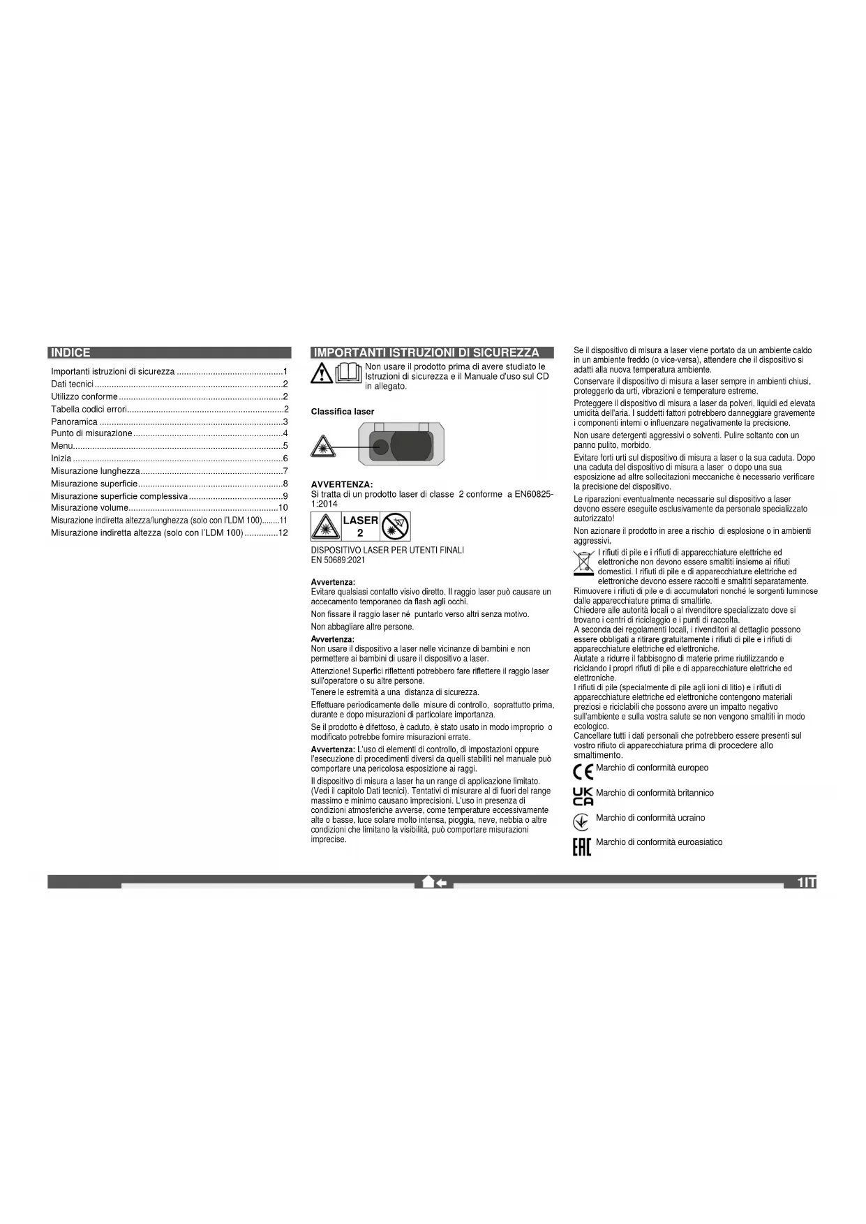 - vvertenza: Non usare il dispositivo a laser nelle vicinanze di bambini e non permettere ai bambini di usare il dispositivo a laser. Attenzione! Superci riettenti potrebbero fare riettere il ra ggio laser sull'operatore o su altre persone. Tenere le estremità a una distanza di sicurezza. Eettuare periodicamente delle misure di controllo, soprattutto prima, durante e dopo misurazioni di particolare importanza. Se il prodotto è difettoso, è caduto, è stato usato in modo improprio o modicato potrebbe fornire misurazioni errate. Avvertenza: L'uso di elementi di controllo, di impostazioni oppure l'esecuzione di procedimenti diversi da quelli stabiliti nel manuale può comportare una pericolosa esposizione ai raggi. Il dispositivo di misura a laser ha un range di applicazione limitato. (Vedi il capitolo Dati tecnici). Tentativi di misurare al di fuori del range massimo e minimo causano imprecisioni. L'uso in presenza di condizioni atmosferiche avverse, come temperature eccessivamente alte o basse, luce solare molto intensa, pioggia, neve, nebbia o altre condizioni che limitano la visibilità, può comportare misurazioni imprecise. Se il dispositivo di misura a laser viene portato da un ambiente caldo in un ambiente freddo (o vice-versa), attendere che il dispositivo si adatti alla nuova temperatura ambiente. Conservare il dispositivo di misura a laser sempre in ambienti chiusi, proteggerlo da urti, vibrazioni e temperature estreme. Proteggere il dispositivo di misura a laser da polveri, liquidi ed elevata umidità dell'aria. I suddetti fattori potrebbero danneggiare gravemente i componenti interni o inuenzare negativamente la precisione. Non usare detergenti aggressivi o solventi. Pulire soltanto con un panno pulito, morbido. Evitare forti urti sul dispositivo di misura a laser o la sua caduta. Dopo una caduta del dispositivo di misura a laser o dopo una sua esposizione ad altre sollecitazioni meccaniche è necessario vericare la precisione del dispositivo. Le riparazioni eventualmente necessarie sul dispositivo a laser devono essere eseguite esclusivamente da personale specializzato autorizzato! Non azionare il prodotto in aree a rischio di esplosione o in ambienti aggressivi. I riuti di pile e i riuti di apparecchiature elettriche ed elettroniche non devono essere smaltiti insieme ai riuti domestici. I riuti di pile e di apparecchiature elettriche ed elettroniche devono essere raccolti e smaltiti separatamente. Rimuovere i riuti di pile e di accumulatori nonché le sorgenti luminose dalle apparecchiature prima di smaltirle. Chiedere alle autorità locali o al rivenditore specializzato dove si trovano i centri di riciclaggio e i punti di raccolta. A seconda dei regolamenti locali, i rivenditori al dettaglio possono essere obbligati a ritirare gratuitamente i riuti di pile e i riuti di apparecchiature elettriche ed elettroniche. Aiutate a ridurre il fabbisogno di materie prime riutilizzando e riciclando i propri riuti di pile e di apparecchiature elettriche ed elettroniche. I riuti di pile (specialmente di pile agli ioni di litio) e i riuti di apparecchiature elettriche ed elettroniche contengono materiali preziosi e riciclabili che possono avere un impatto negativo sull'ambiente e sulla vostra salute se non vengono smaltiti in modo ecologico. Cancellare tutti i dati personali che potrebbero essere presenti sul vostro riuto di apparecchiatura p rima di procedere allo smaltimento. Marchio di conformità europeo Marchio di conformità britannico Marchio di conformità ucraino Marchio di conformità euroasiatico INDICE Importanti istruzioni di sicurezza p. 1