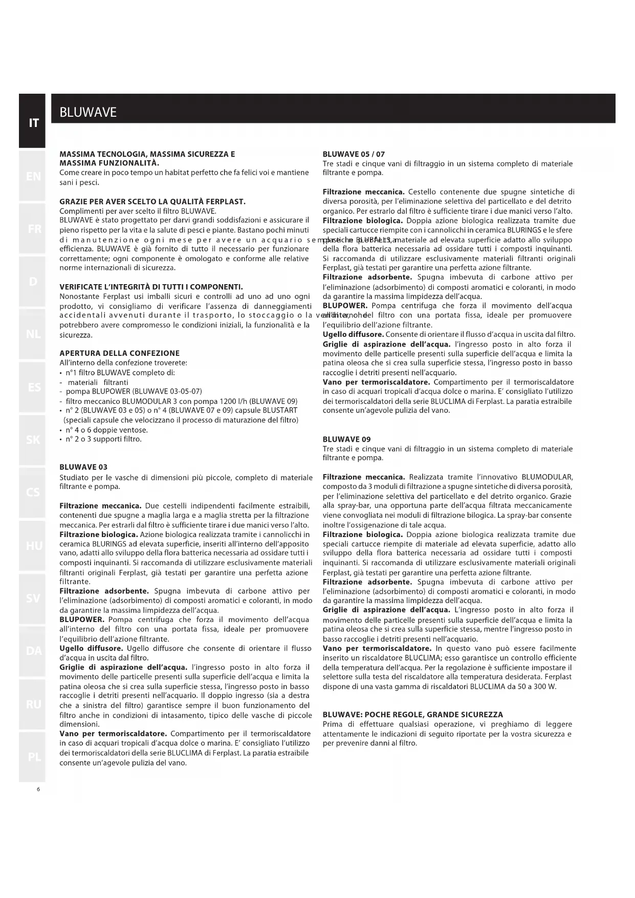 Ferplast garantisce il filtrlo BLUWAVE e tutti i loro componenti ed accessori entro i limiti previsti alla presente clausola e dalle disposizioni di legge vigenti. La garanzia è valida unicamente per difet di fabricazione e comprende la riparazione o la sostenuzione gratuite. La garanzia decade per danni e/o difetti provocati da incuria, usura, uso non conforme alle indicazioni ed avventenze riportate nel presente libero, incidenti, manomissioni, uso improperio, riparazioni errate, acquisto non comprovato dallo scontrino fiscale. Sono escludi alla garanzia le spugne ed i materiali filtranti in genere.