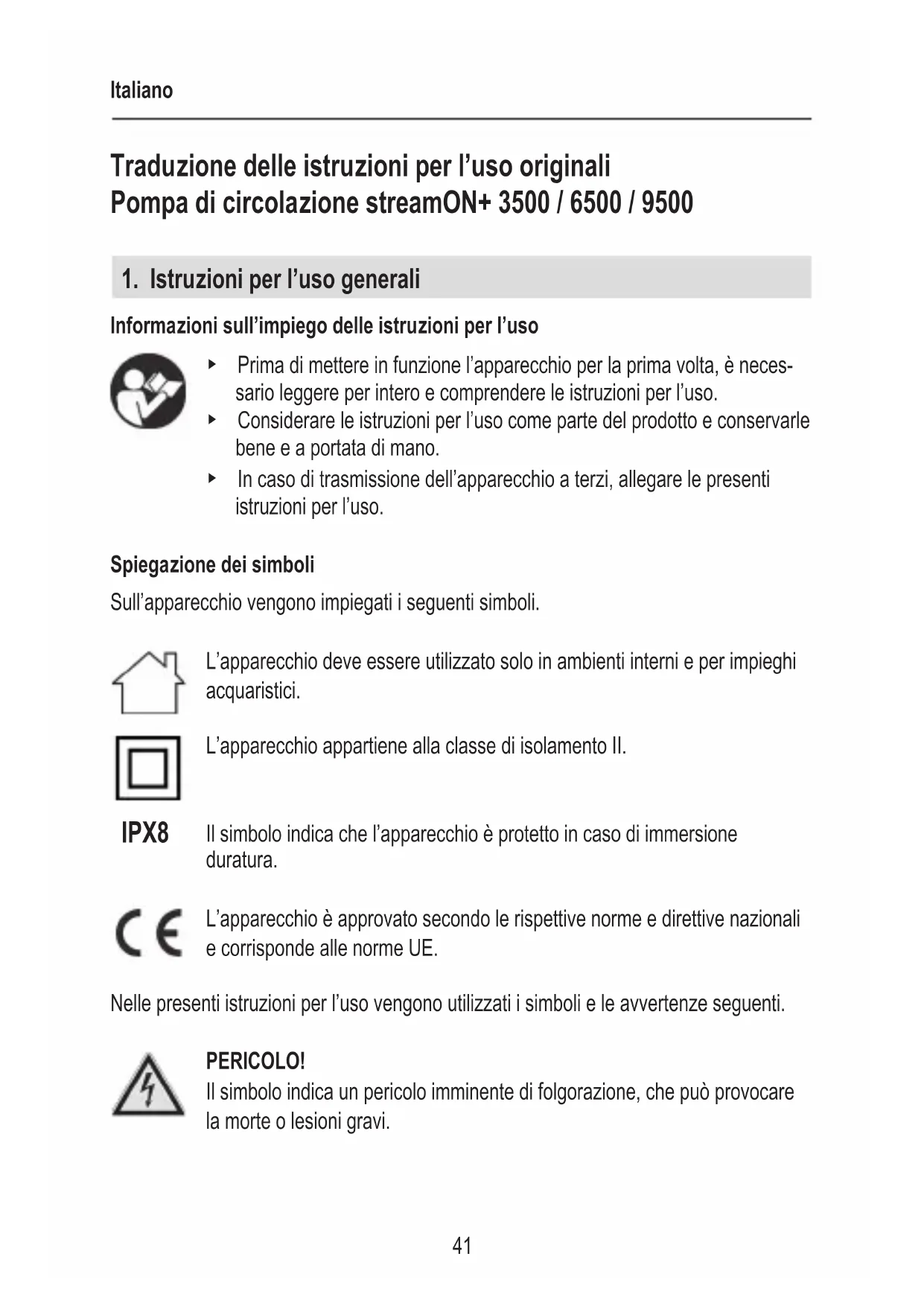 Informazioni sull’impiego delle istruzioni per l’uso ▶ Prima di mettere in funzione l’apparecchio per la prima volta, è neces- sario leggere per intero e comprendere le istruzioni per l’uso. ▶ Considerare le istruzioni per l’uso come parte del prodotto e conservarle bene e a portata di mano. ▶ In caso di trasmissione dell’apparecchio a terzi, allegare le presenti istruzioni per l’uso. Spiegazione dei simboli Sull’apparecchio vengono impiegati i seguenti simboli. L’apparecchio deve essere utilizzato solo in ambienti interni e per impieghi acquaristici. L’apparecchio appartiene alla classe di isolamento II. Il simbolo indica che l’apparecchio è protetto in caso di immersione duratura. L’apparecchio è approvato secondo le rispettive norme e direttive nazionali e corrisponde alle norme UE. Nelle presenti istruzioni per l’uso vengono utilizzati i simboli e le avvertenze seguenti. PERICOLO! Il simbolo indica un pericolo imminente di folgorazione, che può provocare la morte o lesioni gravi. IPX8Italiano