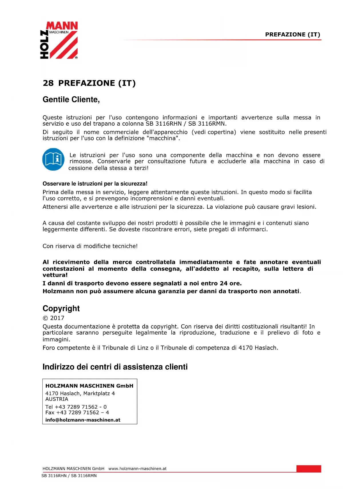28 PREFAZIONE (IT) Gentile Cliente, Queste istruzioni per l'uso contengono informazioni e importanti avvertenze sulla messa in servizio e uso del trapano a colonna SB 3116RHN / SB 3116RMN. Di seguito il nome commerciale dell'apparecchio (vedi copertina) viene sostituito nelle presenti istruzioni per l'uso con la definizione "macchina". Le istruzioni per l'uso sono una componente della macchina e non devono essere rimosse. Conservarle per consultazione futura e accluderle alla macchina in caso di cessione della stessa a terzi! Osservare le istruzioni per la sicurezza! Prima della messa in servizio, leggere attentamente queste istruzioni. In questo modo si facilita l'uso corretto, e si prevengono incomprensioni e danni eventuali. Attenersi alle avvertenze e alle istruzioni per la sicurezza. La violazione può causare gravi lesioni. A causa del costante sviluppo dei nostri prodotti è possibile che le immagini e i contenuti siano leggermente differenti. Se doveste riscontrare errori, siete pregati di informarci. Con riserva di modifiche tecniche! Al ricevimento della merce controllatela immediatamente e fate annotare eventuali contestazioni al momento della consegna, all'addetto al recapito, sulla lettera di vettura! I danni di trasporto devono essere segnalati a noi entro 24 ore. Holzmann non può assumere alcuna garanzia per danni da trasporto non annotati. Copyright © 2017 Questa documentazione è protetta da copyright. Con riserva dei diritti costituzionali risultanti! In particolare saranno perseguite legalmente la riproduzione, traduzione e il prelievo di foto e immagini. Foro competente è il Tribunale di Linz o il Tribunale di competenza di 4170 Haslach. Indirizzo dei centri di assistenza clienti