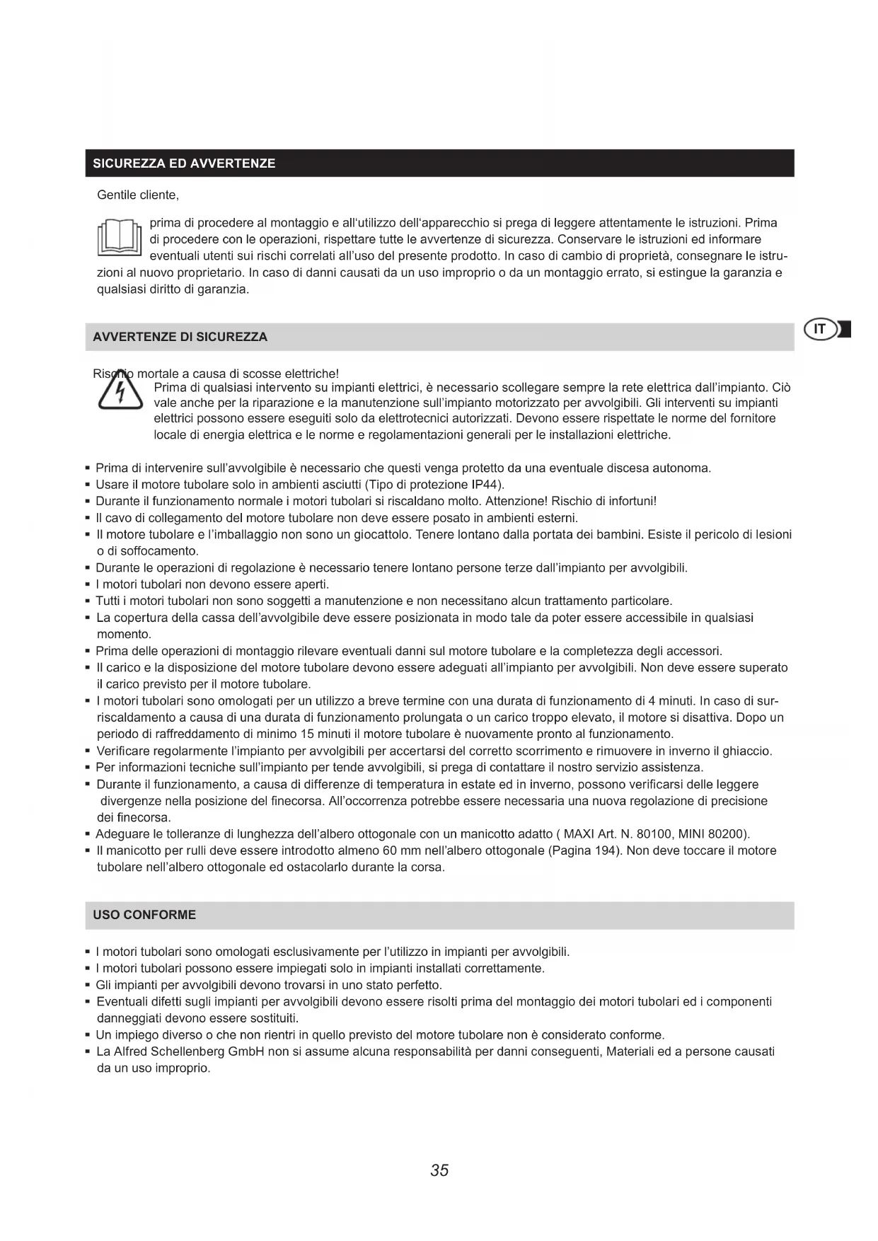 Rischio mortale a causa di scosse elettriche! Prima di qualsiasi intervento su impianti elettrici, è necessario scollegare sempre la rete elettrica dall’impianto. Ciò vale anche per la riparazione e la manutenzione sull’impianto motorizzato per avvolgibili. Gli interventi su impianti elettrici possono essere eseguiti solo da elettrotecnici autorizzati. Devono essere rispettate le norme del fornitore locale di energia elettrica e le norme e regolamentazioni generali per le installazioni elettriche. Prima di intervenire sull’avvolgibile è necessario che questi venga protetto da una eventuale discesa autonoma. Usare il motore tubolare solo in ambienti asciutti (Tipo di protezione IP44). Durante il funzionamento normale i motori tubolari si riscaldano molto. Attenzione! Rischio di infortuni! Il cavo di collegamento del motore tubolare non deve essere posato in ambienti esterni. Il motore tubolare e l’imballaggio non sono un giocattolo. Tenere lontano dalla portata dei bambini. Esiste il pericolo di lesioni o di soffocamento. Durante le operazioni di regolazione è necessario tenere lontano persone terze dall’impianto per avvolgibili. I motori tubolari non devono essere aperti. Tutti i motori tubolari non sono soggetti a manutenzione e non necessitano alcun trattamento particolare. La copertura della cassa dell’avvolgibile deve essere posizionata in modo tale da poter essere accessibile in qualsiasi momento. Prima delle operazioni di montaggio rilevare eventuali danni sul motore tubolare e la completezza degli accessori. Il carico e la disposizione del motore tubolare devono essere adeguati all’impianto per avvolgibili. Non deve essere superato il carico previsto per il motore tubolare. I motori tubolari sono omologati per un utilizzo a breve termine con una durata di funzionamento di 4 minuti. In caso di sur- riscaldamento a causa di una durata di funzionamento prolungata o un carico troppo elevato, il motore si disattiva. Dopo un periodo di raffreddamento di minimo 15 minuti il motore tubolare è nuovamente pronto al funzionamento. Vericare regolarmente l’impianto per avvolgibili per accertarsi del corretto scorrimento e rimuovere in inverno il ghiaccio. Per informazioni tecniche sull’impianto per tende avvolgibili, si prega di contattare il nostro servizio assistenza. Durante il funzionamento, a causa di differenze di temperatura in estate ed in inverno, possono vericarsi delle leggere divergenze nella posizione del necorsa. All’occorrenza potrebbe essere necessaria una nuova regolazione di precisione dei necorsa. Adeguare le tolleranze di lunghezza dell’albero ottogonale con un manicotto adatto ( MAXI Art. N. 80100, MINI 80200). Il manicotto per rulli deve essere introdotto almeno 60 mm nell’albero ottogonale (Pagina 194). Non deve toccare il motore tubolare nell’albero ottogonale ed ostacolarlo durante la corsa. USO CONFORmE I motori tubolari sono omologati esclusivamente per l’utilizzo in impianti per avvolgibili. I motori tubolari possono essere impiegati solo in impianti installati correttamente. Gli impianti per avvolgibili devono trovarsi in uno stato perfetto. Eventuali difetti sugli impianti per avvolgibili devono essere risolti prima del montaggio dei motori tubolari ed i componenti danneggiati devono essere sostituiti. Un impiego diverso o che non rientri in quello previsto del motore tubolare non è considerato conforme. La Alfred Schellenberg GmbH non si assume alcuna responsabilità per danni conseguenti, Materiali ed a persone causati da un uso improprio.36