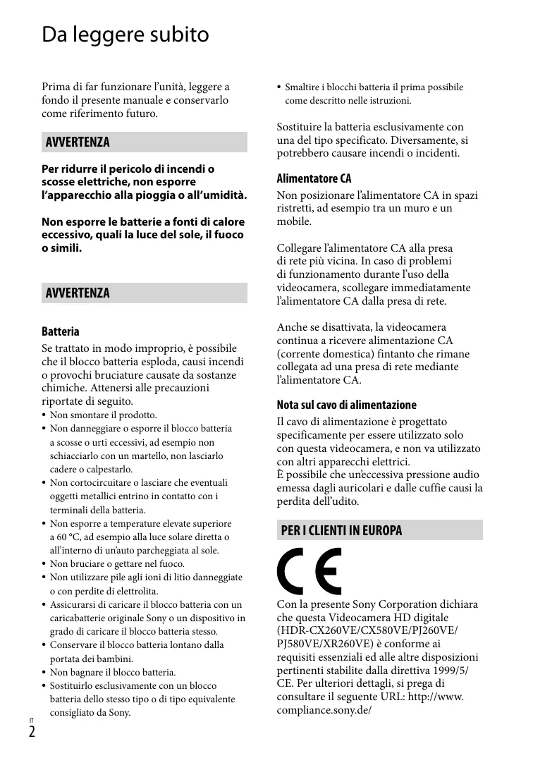 PJ580VE/XR260VE) è conforme ai requisiti essenziali ed alle altre disposizioni pertinenti stabilite dalla direttiva 1999/5/ CE. Per ulteriori dettagli, si prega di consultare il seguente URL: http://www. compliance.sony.de/ Avviso per i clienti residenti nei paesi che applicano le direttive UE Questo prodotto è realizzato da Sony Corporation, 1-7-1 Konan Minato-ku Tokyo, 108-0075 Giappone. Il Rappresentante autorizzato per la conformità alle direttive EMC e per la sicurezza dei prodotti è Sony Deutschland GmbH, Hedelfinger Strasse 61, 70327 Stuttgart, Germania. Per qualsiasi questione relativa all’assistenza o alla garanzia, consultare gli indirizzi forniti a parte nei relativi documenti. Attenzione Il campo elettromagnetico alle frequenze specifiche può influenzare l’immagine e il suono di questa unità. Questo prodotto è stato testato ed è risultato conforme ai limiti stabiliti nella regolazione EMC relativa all’uso dei cavi di collegamento di lunghezza inferiore a 3 metri. Nota Se l’elettricità statica o interferenze elettromagnetiche causano l’interruzione del trasferimento dei dati, che pertanto non avviene, è necessario riavviare l’applicazione oppure scollegare, quindi ricollegare il cavo di comunicazione (USB e così via). Trattamento del dispositivo elettrico o elettronico a fine vita (applicabile in tutti i paesi dell’Unione Europea e in altri paesi europei con sistema di raccolta differenziata) Questo simbolo sul prodotto o sulla confezione indica che il prodotto non deve essere considerato come un normale rifiuto domestico, ma deve invece essere consegnato ad un punto di raccolta appropriato per il riciclo di apparecchi elettrici ed elettronici. Assicurandovi che questo prodotto sia smaltito correttamente, voi contribuirete a prevenire potenziali conseguenze negative per l’ambiente e per la salute che potrebbero altrimenti essere causate dal suo smaltimento inadeguato. Il riciclaggio dei materiali aiuta a conservare le risorse naturali. Per informazioni più dettagliate circa il riciclaggio di questo prodotto, potete contattare l’ufficio comunale, il servizio locale di smaltimento rifiuti oppure il negozio dove l’avete acquistato. In caso di smaltimento abusivo di apparecchiature elettriche e/o elettroniche potrebbero essere applicate le sanzioni previste dalla normativa applicabile (valido solo per l’Italia). Trattamento delle pile esauste (applicabile in tutti i paesi dell’Unione Europea e in altri paesi Europei con sistema di raccolta differenziata) Questo simbolo sul prodotto o sulla confezione indica che la pila non deve essere considerata un normale rifiuto domestico. Su alcuni tipi di pile questo simbolo potrebbe essere utilizzato in combinazione con un simbolo chimico. I simboli chimici del mercurio (Hg) o del piombo (Pb) sono aggiunti, se la batteria contiene più dello 0,0005% di mercurio o dello 0,004% di piombo. Assicurandovi che le pile siano smaltite correttamente, contribuirete a prevenire potenziali conseguenze negative per l’ambiente e per la salute che potrebbero altrimenti essere causate dal loro inadeguato smaltimento. Il riciclaggio dei materiali aiuta a conservare le risorse naturali. In caso di prodotti che per motivi di sicurezza, prestazione o protezione dei dati richiedano un collegamento fisso ad una pila interna, la stessa dovrà essere sostituita solo da personale di assistenza qualificato. Consegnare il prodotto a fine vita al punto di raccolta idoneo allo smaltimento di apparecchiature elettriche ed elettroniche; questo assicura che anche la pila al suo