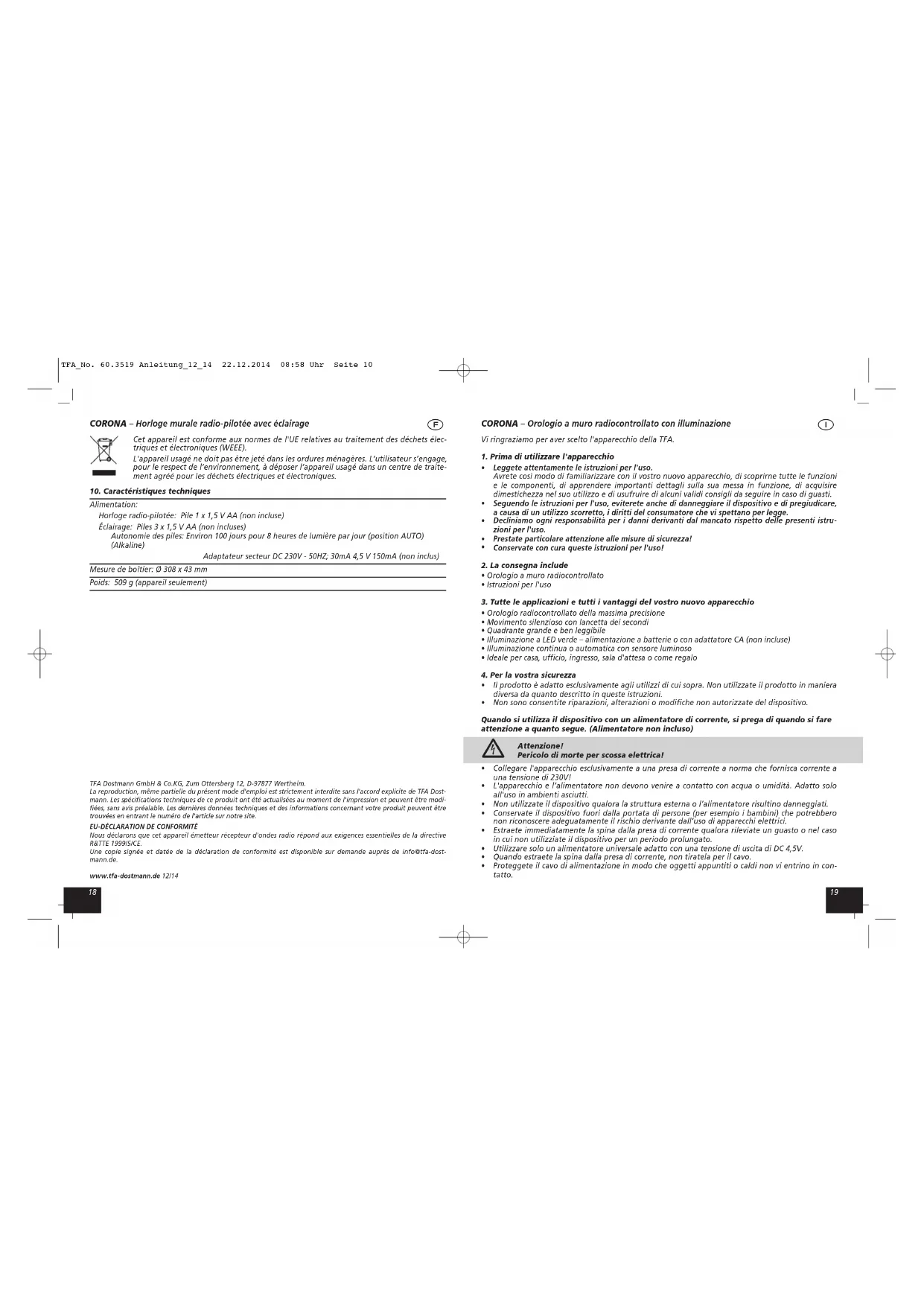 Con la presente dichiariamo che questo impianto radio adempie alle prescrizioni sostanziali della direttiva R&TTE 1999/5/CE. Una copia firmata e datata della Dichiarazione di Conformità è disponibile, su richiesta all'indirizzo info@tfa-dost- mann.de. www.tfa-dostmann.de 12/14 CORONA – Orologio a muro radiocontrollato con illuminazione