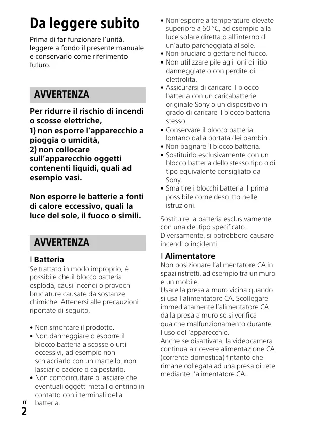 • Non esporre a temperature elevate superiore a 60 °C, ad esempio alla luce solare diretta o all’interno di un’auto parcheggiata al sole. • Non bruciare o gettare nel fuoco. • Non utilizzare pile agli ioni di litio danneggiate o con perdite di elettrolita. • Assicurarsi di caricare il blocco batteria con un caricabatterie originale Sony o un dispositivo in grado di caricare il blocco batteria stesso. • Conservare il blocco batteria lontano dalla portata dei bambini. • Non bagnare il blocco batteria. • Sostituirlo esclusivamente con un blocco batteria dello stesso tipo o di tipo equivalente consigliato da Sony. • Smaltire i blocchi batteria il prima possibile come descritto nelle istruzioni. Sostituire la batteria esclusivamente con una del tipo specificato. Diversamente, si potrebbero causare incendi o incidenti.
