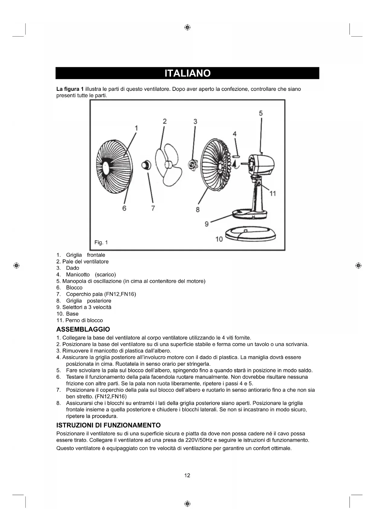 Posizionare il ventilatore su di una superficie sicura e piatta da dove non possa cadere né il cavo possa essere tirato. Collegare il ventilatore ad una presa da 220V/50Hz e seguire le istruzioni di funzionamento. Questo ventilatore è equipaggiato con tre velocità di ventilazione per garantire un confort ottimale. Fig. 113