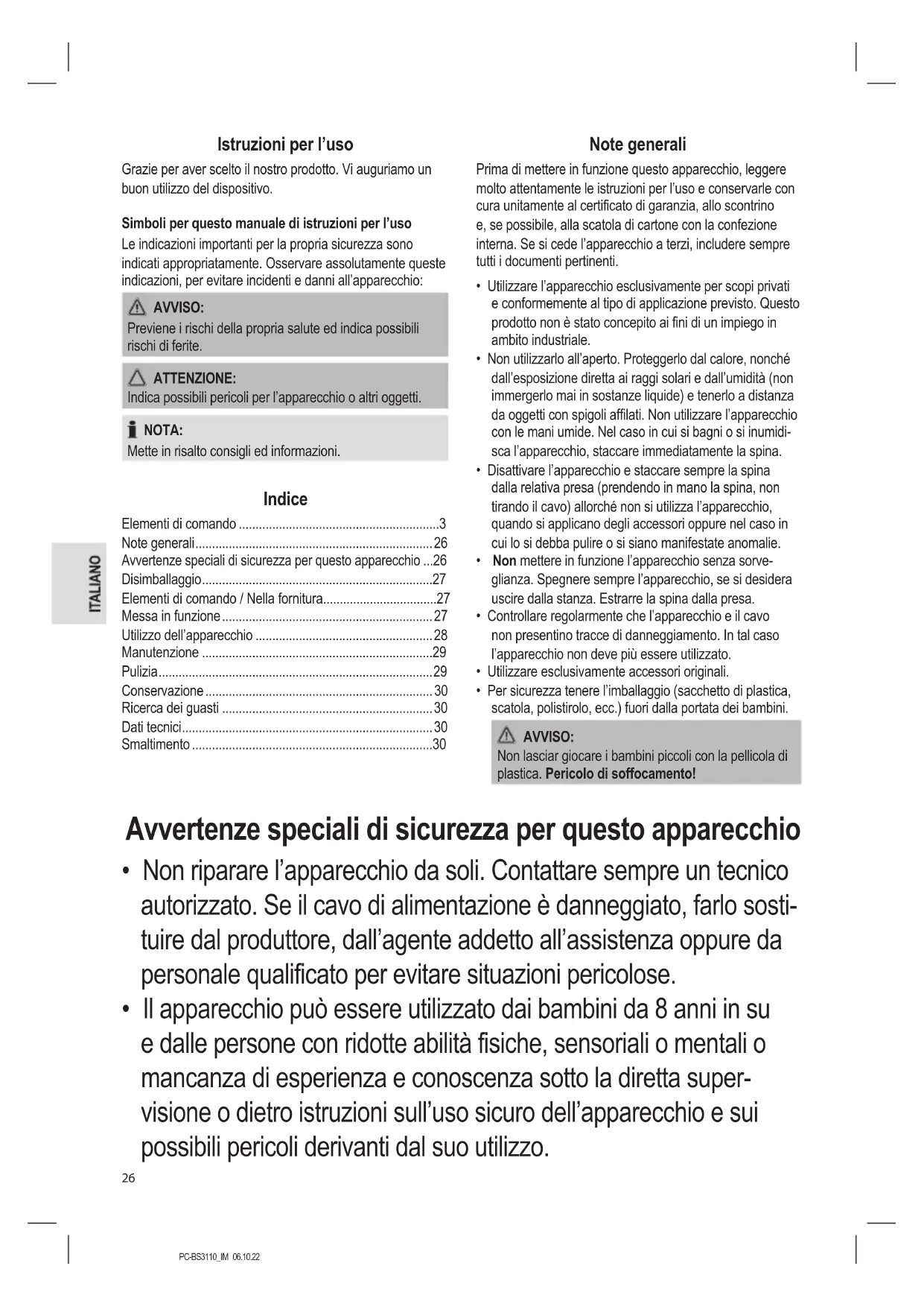 - Il apparecchio può essere utilizzato dai bambini da 8 anni in su e dalle persone con ridotte abilità fisiche, sensoriali o mentali o mancanza di esperienza e conoscenza sotto la diretta super- visione o dietro istruzioni sull’uso sicuro dell’apparecchio e sui possibili pericoli derivanti dal suo utilizzo.PC-BS3110_IM 06.10.22