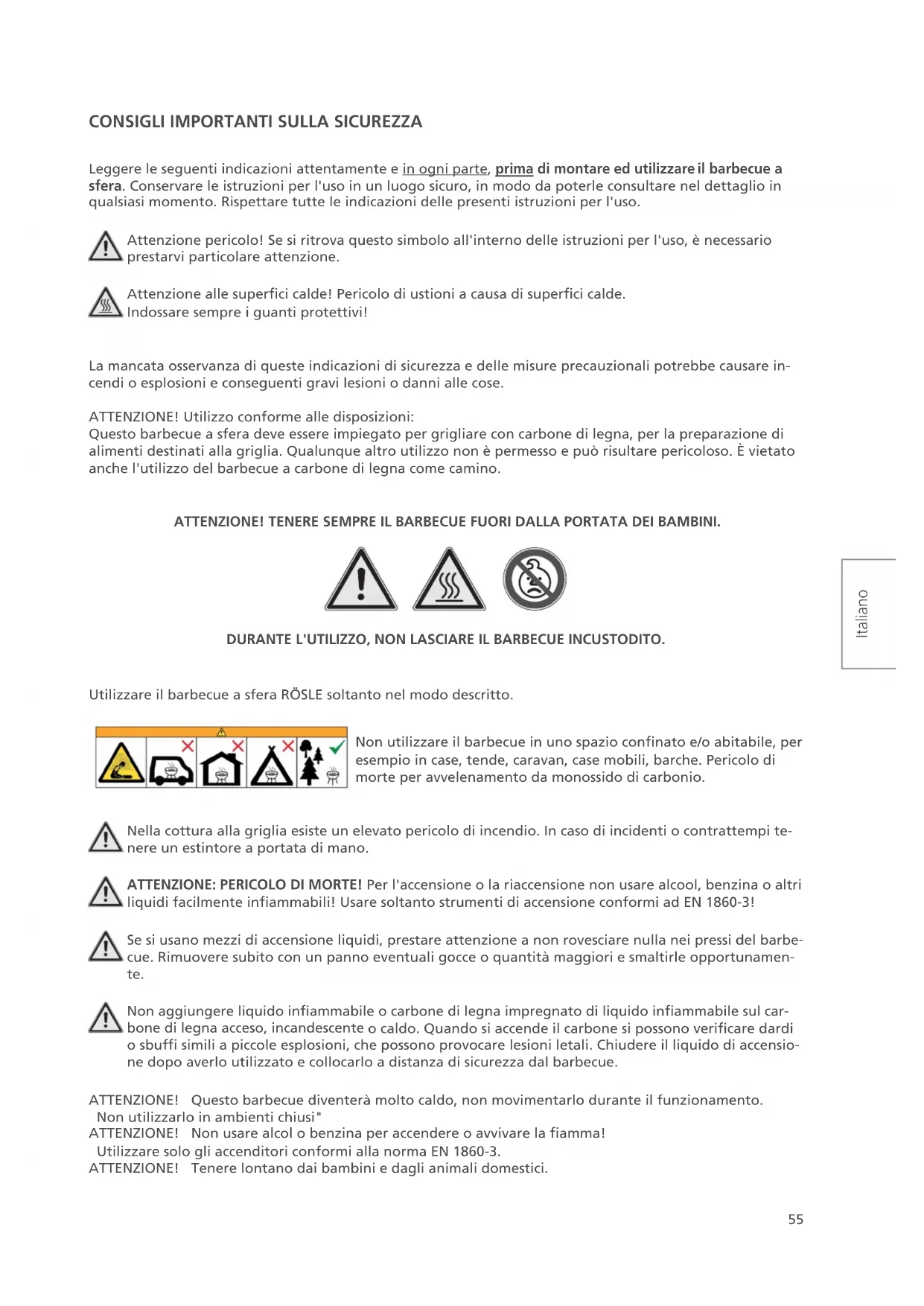 Leggere le seguenti indicazioni attentamente e in ogni parte, prima di montare ed utilizzare il barbecue a sfera. Conservare le istruzioni per l'uso in un luogo sicuro, in modo da poterle consultare nel dettaglio in qualsiasi momento. Rispettare tutte le indicazioni delle presenti istruzioni per l'uso. Attenzione pericolo! Se si ritrova questo simbolo all'interno delle istruzioni per l'uso, è necessario prestarvi particolare attenzione. Attenzione alle superci calde! Pericolo di ustioni a causa di superci calde. Indossare sempre i guanti protettivi! La mancata osservanza di queste indicazioni di sicurezza e delle misure precauzionali potrebbe causare in- cendi o esplosioni e conseguenti gravi lesioni o danni alle cose. ATTENZIONE! Utilizzo conforme alle disposizioni: Questo barbecue a sfera deve essere impiegato per grigliare con carbone di legna, per la preparazione di alimenti destinati alla griglia. Qualunque altro utilizzo non è permesso e può risultare pericoloso. È vietato anche l'utilizzo del barbecue a carbone di legna come camino. ATTENZIONE! TENERE SEMPRE IL BARBECUE FUORI DALLA PORTATA DEI BAMBINI. DURANTE L'UTILIZZO, NON LASCIARE IL BARBECUE INCUSTODITO. Utilizzare il barbecue a sfera RÖSLE soltanto nel modo descritto. Non utilizzare il barbecue in uno spazio connato e/o abitabile, per esempio in case, tende, caravan, case mobili, barche. Pericolo di morte per avvelenamento da monossido di carbonio. Nella cottura alla griglia esiste un elevato pericolo di incendio. In caso di incidenti o contrattempi te- nere un estintore a portata di mano. ATTENZIONE: PERICOLO DI MORTE! Per l'accensione o la riaccensione non usare alcool, benzina o altri liquidi facilmente inammabili! Usare soltanto strumenti di accensione conformi ad EN 1860-3! Se si usano mezzi di accensione liquidi, prestare attenzione a non rovesciare nulla nei pressi del barbe- cue. Rimuovere subito con un panno eventuali gocce o quantità maggiori e smaltirle opportunamen- te. Non aggiungere liquido inammabile o carbone di legna impregnato di liquido inammabile sul car- bone di legna acceso, incandescente o caldo. Quando si accende il carbone si possono vericare dardi o sbuf simili a piccole esplosioni, che possono provocare lesioni letali. Chiudere il liquido di accensio- ne dopo averlo utilizzato e collocarlo a distanza di sicurezza dal barbecue. ATTENZIONE! Questo barbecue diventerà molto caldo, non movimentarlo durante il funzionamento. Non utilizzarlo in ambienti chiusi" ATTENZIONE! Non usare alcol o benzina per accendere o avvivare la amma! Utilizzare solo gli accenditori conformi alla norma EN 1860-3. ATTENZIONE! Tenere lontano dai bambini e dagli animali domestici.56 Italiano ATTENZIONE! Non lasciare bambini e animali nelle vicinanze di un barbecue acceso senza il controllo di un adulto. ATTENZIONE! Questo barbecue a sfera diventa molto caldo e non deve essere spostato quando è in funzione. Altre importanti informazioni sui pericoli Non utilizzare in ambienti chiusi per la formazione di vapori velenosi che possono portare a lesioni gra-