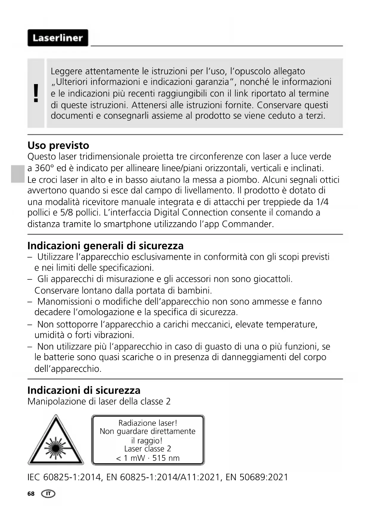 Uso previsto Questo laser tridimensionale proietta tre circonferenze con laser a luce verde a 360° ed è indicato per allineare linee/piani orizzontali, verticali e inclinati. Le croci laser in alto e in basso aiutano la messa a piombo. Alcuni segnali ottici avvertono quando si esce dal campo di livellamento. Il prodotto è dotato di una modalità ricevitore manuale integrata e di attacchi per treppiede da 1/4 pollici e 5/8 pollici. L’interfaccia Digital Connection consente il comando a distanza tramite lo smartphone utilizzando l’app Commander. Indicazioni generali di sicurezza – Utilizzare l‘apparecchio esclusivamente in conformità con gli scopi previsti e nei limiti delle specicazioni. – Gli apparecchi di misurazione e gli accessori non sono giocattoli. Conservare lontano dalla portata di bambini. – Manomissioni o modiche dell‘apparecchio non sono ammesse e fanno decadere l‘omologazione e la specica di sicurezza. – Non sottoporre l‘apparecchio a carichi meccanici, elevate temperature, umidità o forti vibrazioni. – Non utilizzare più l‘apparecchio in caso di guasto di una o più funzioni, se le batterie sono quasi scariche o in presenza di danneggiamenti del corpo dell’apparecchio. Indicazioni di sicurezza Manipolazione di laser della classe 2
