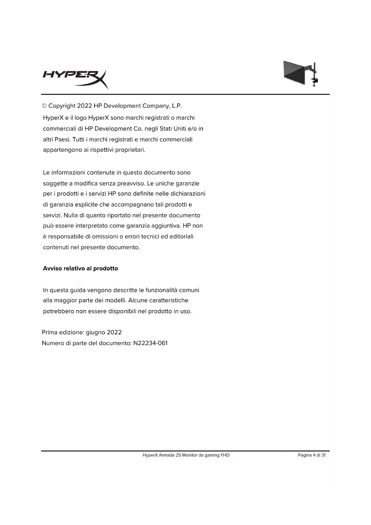 © Copyright 2022 HP Development Company, L.P. HyperX e il logo HyperX sono marchi registrati o marchi commerciali di HP Development Co. negli Stati Uniti e/o in altri Paesi. Tutti i marchi registrati e marchi commerciali appartengono ai rispettivi proprietari. Le informazioni contenute in questo documento sono soggette a modifica senza preavviso. Le uniche garanzie per i prodotti e i servizi HP sono definite nelle dichiarazioni di garanzia esplicite che accompagnano tali prodotti e servizi. Nulla di quanto riportato nel presente documento può essere interpretato come garanzia aggiuntiva. HP non è responsabile di omissioni o errori tecnici ed editoriali contenuti nel presente documento. Avviso relativo al prodotto In questa guida vengono descritte le funzionalità comuni alla maggior parte dei modelli. Alcune caratteristiche potrebbero non essere disponibili nel prodotto in uso. Prima edizione: giugno 2022 Numero di parte del documento: N22234-061HyperX Armada 25 Monitor da gaming FHD Pagina 5 di 31