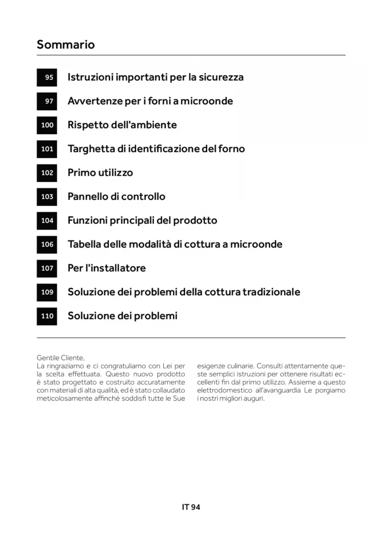 - Adoperare solo utensili appropriati per i forni a microonde.IT 94 IT 95 Gentile Cliente, La ringraziamo e ci congratuliamo con Lei per la scelta eettuata. Questo nuovo prodotto è stato progettato e costruito accuratamente con materiali di alta qualità, ed è stato collaudato meticolosamente anché soddis tutte le Sue esigenze culinarie. Consulti attentamente que- ste semplici istruzioni per ottenere risultati ec- cellenti n dal primo utilizzo. Assieme a questo elettrodomestico all'avanguardia Le porgiamo inostri migliori auguri. Istruzioni importanti per la sicurezza Avvertenze per i forni a microonde Rispetto dell'ambiente Targhetta di identicazione del forno Primo utilizzo Pannello di controllo Funzioni principali del prodotto Tabella delle modalità di cottura a microonde Per l'installatore Soluzione dei problemi della cottura tradizionale Soluzione dei problemi