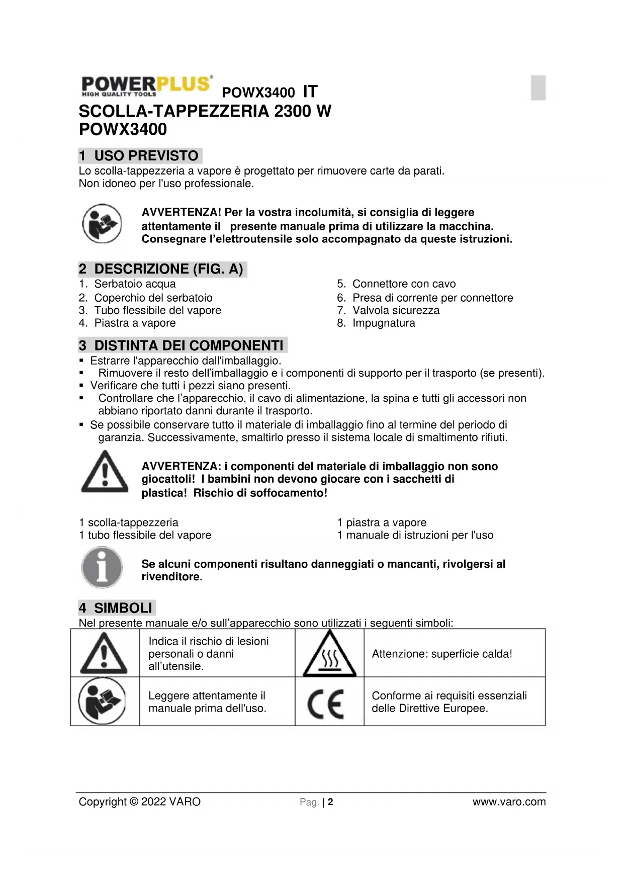 Copyright © 2022 VARO Pag. | 2 www.varo.com SCOLLA-TAPPEZZERIA 2300 W POWX3400 1 USO PREVISTO Lo scolla-tappezzeria a vapore è progettato per rimuovere carte da parati. Non idoneo per l'uso professionale. AVVERTENZA! Per la vostra incolumità, si consiglia di leggere attentamente il presente manuale prima di utilizzare la macchina. Consegnare l’elettroutensile solo accompagnato da queste istruzioni. 2 DESCRIZIONE (FIG. A)