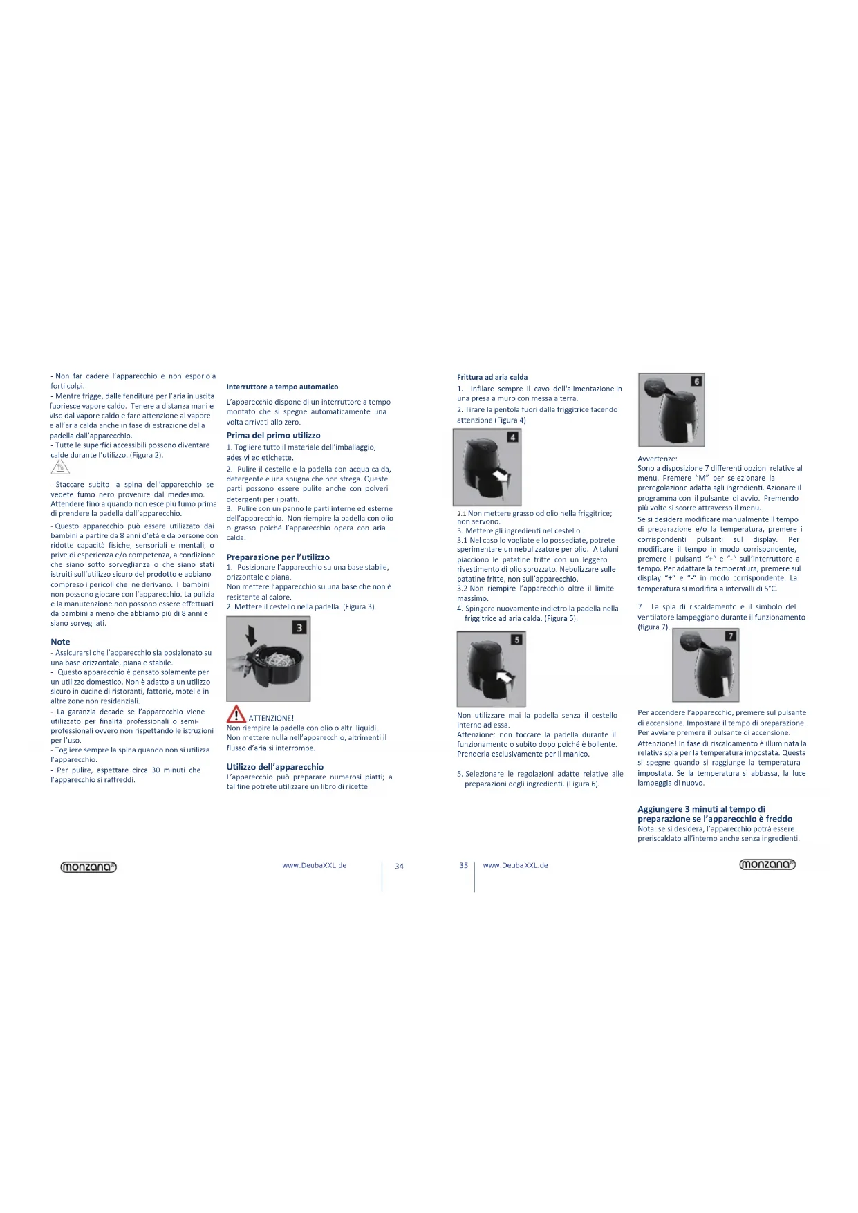www.DeubaXXL.de www.DeubaXXL.de - Non far cadere l’apparecchio e non esporlo a forti colpi. - Mentre frigge, dalle fenditure per l’aria in uscita fuoriesce vapore caldo. Tenere a distanza mani e viso dal vapore caldo e fare attenzione al vapore e all’aria calda anche in fase di estrazione della padella dall’apparecchio. - Tutte le superfici accessibili possono diventare calde durante l’utilizzo. (Figura 2). - Staccare subito la spina dell’apparecchio se vedete fumo nero provenire dal medesimo. Attendere fino a quando non esce più fumo prima di prendere la padella dall’apparecchio. - Questo apparecchio può essere utilizzato dai bambini a partire da 8 anni d’età e da persone con ridotte capacità fisiche, sensoriali e mentali, o prive di esperienza e/o competenza, a condizione che siano sotto sorveglianza o che siano stati istruiti sull’utilizzo sicuro del prodotto e abbiano compreso i pericoli che ne derivano. I bambini non possono giocare con l’apparecchio. La pulizia e la manutenzione non possono essere effettuati da bambini a meno che abbiamo più di 8 anni e siano sorvegliati. Note - Assicurarsi che l’apparecchio sia posizionato su una base orizzontale, piana e stabile. - Questo apparecchio è pensato solamente per un utilizzo domestico. Non è adatto a un utilizzo sicuro in cucine di ristoranti, fattorie, motel e in altre zone non residenziali. - La garanzia decade se l’apparecchio viene utilizzato per finalità professionali o semi- professionali ovvero non rispettando le istruzioni per l’uso. - Togliere sempre la spina quando non si utilizza l’apparecchio. - Per pulire, aspettare circa 30 minuti che l’apparecchio si raffreddi. Interruttore a tempo automatico L’apparecchio dispone di un interruttore a tempo montato che si spegne automaticamente una volta arrivati allo zero. Prima del primo utilizzo