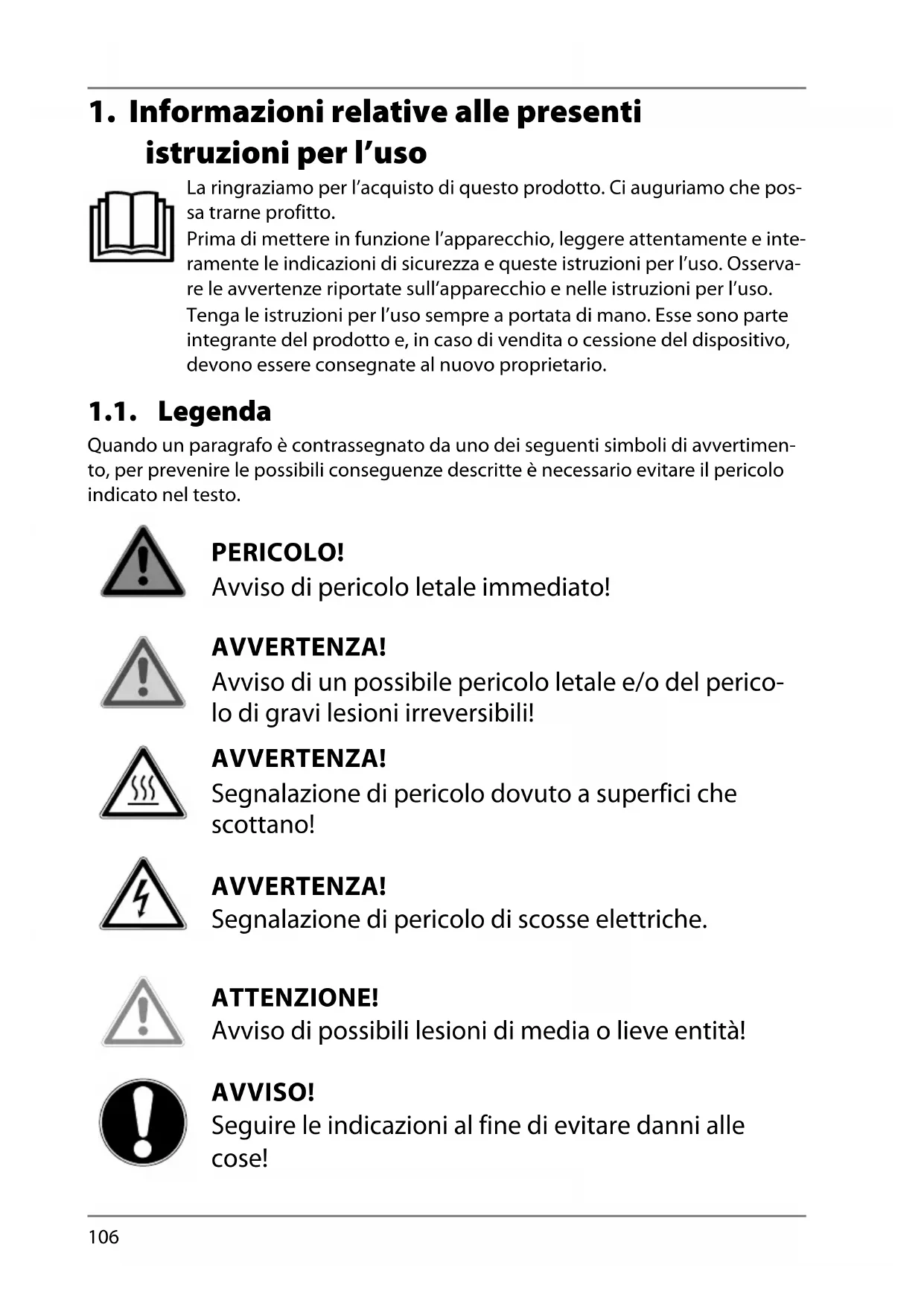 1. Informazioni relative alle presenti istruzioni per l’uso ........................ 106
