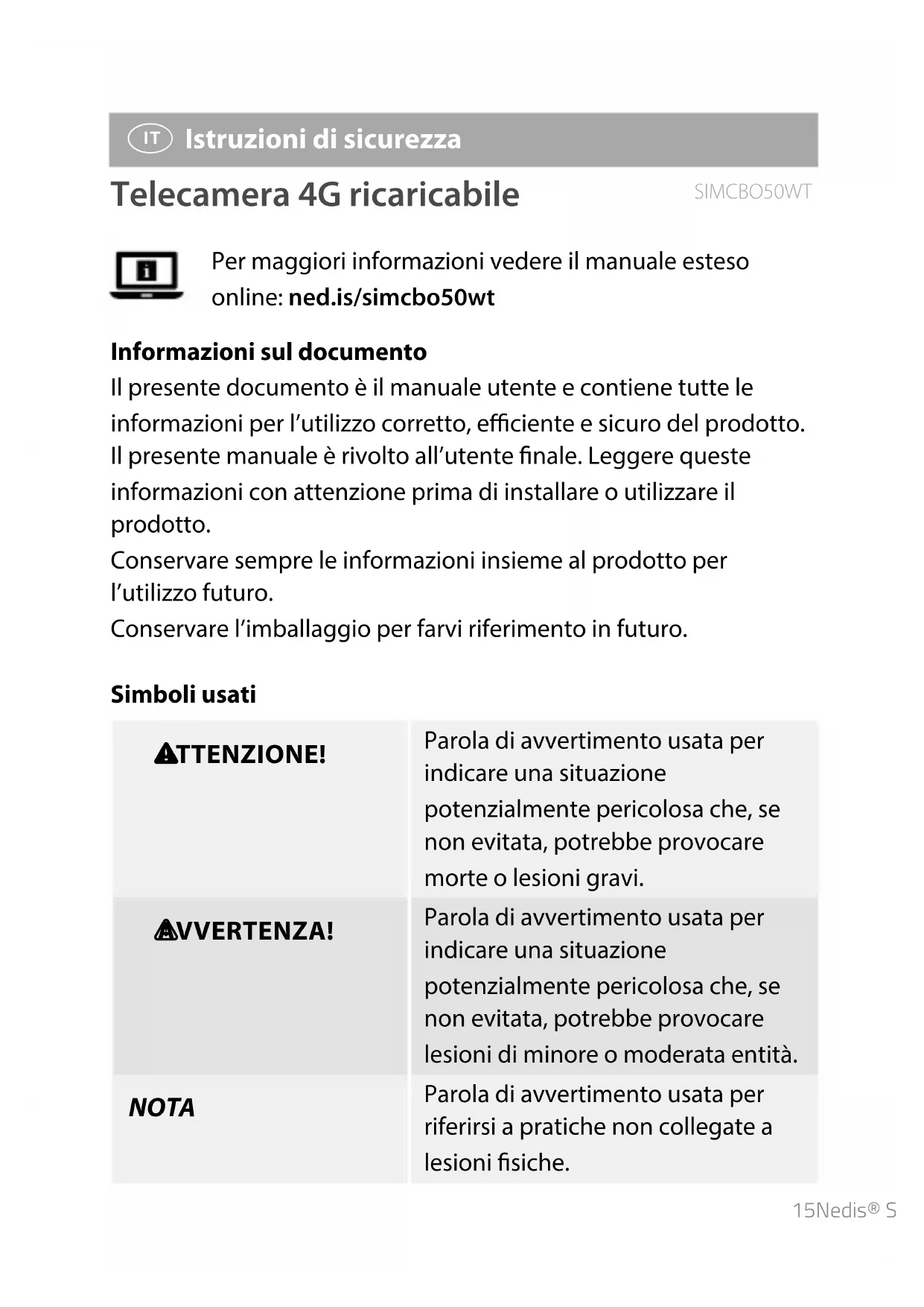 Istruzioni di sicurezza Telecamera 4G ricaricabile SIMCBO50WT Per maggiori informazioni vedere il manuale esteso online: ned.is/simcbo50wt Informazioni sul documento Il presente documento è il manuale utente e contiene tutte le informazioni per l’utilizzo corretto, eciente e sicuro del prodotto. Il presente manuale è rivolto all’utente nale. Leggere queste informazioni con attenzione prima di installare o utilizzare il prodotto. Conservare sempre le informazioni insieme al prodotto per l’utilizzo futuro. Conservare l’imballaggio per farvi riferimento in futuro. Simboli usati ATTENZIONE! Parola di avvertimento usata per indicare una situazione potenzialmente pericolosa che, se non evitata, potrebbe provocare morte o lesioni gravi. AVVERTENZA! Parola di avvertimento usata per indicare una situazione potenzialmente pericolosa che, se non evitata, potrebbe provocare lesioni di minore o moderata entità. NOTA Parola di avvertimento usata per riferirsi a pratiche non collegate a lesioni siche.16 Uso previsto Il prodotto è inteso come telecamera esterna per vedere, ascoltare e parlare ai visitatori presenti all’esterno attraverso l’uso dell’app SmartLife sul proprio telefono cellulare. Utilizzare il prodotto solo come descritto nel presente manuale. Istruzioni di sicurezza