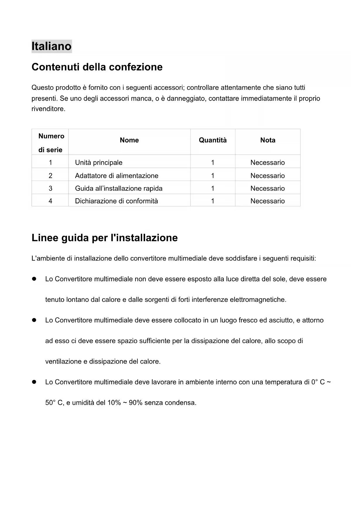 Linee guida per l'installazione L'ambiente di installazione dello convertitore multimediale deve soddisfare i seguenti requisiti: l Lo Convertitore multimediale non deve essere esposto alla luce diretta del sole, deve essere tenuto lontano dal calore e dalle sorgenti di forti interferenze elettromagnetiche. l Lo Convertitore multimediale deve essere collocato in un luogo fresco ed asciutto, e attorno ad esso ci deve essere spazio sufficiente per la dissipazione del calore, allo scopo di ventilazione e dissipazione del calore. l Lo Convertitore multimediale deve lavorare in ambiente interno con una temperatura di 0° C ~ 50° C, e umidità del 10% ~ 90% senza condensa.Spiegazione dei simboli Il simbolo con il punto esclamativo nel triangolo viene utilizzato per indicare informazioni importanti in queste istruzioni per l'uso. Leggere sempre attentamente queste informazioni. Disposizione WEEE: smaltire il prodotto in un punto di riciclaggio. Non smaltire insieme ai rifiuti domestici. La conservazione/lo smaltimento non corretto può danneggiare l'ambiente e/o causare lesioni. Istruzioni di sicurezza Leggere attentamente le istruzioni per l'uso e osservare in particolare le informazioni sulla sicurezza. Se non si seguono le istruzioni di sicurezza e le informazioni sulla corretta gestione in questo manuale, non ci assumiamo alcuna responsabilità per eventuali lesioni personali o danni alla proprietà che ne derivano. Tali casi invalideranno la garanzia/garanzia. a) Informazioni generali