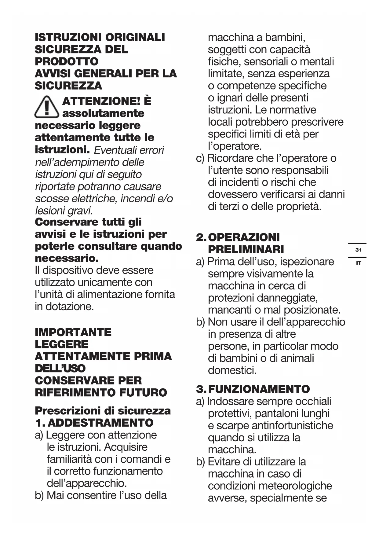 a) Leggere con attenzione le istruzioni. Acquisire familiarità con i comandi e il corretto funzionamento dell’apparecchio. b) Mai consentire l’uso della macchina a bambini, soggetti con capacità siche, sensoriali o mentali limitate, senza esperienza o competenze speciche o ignari delle presenti istruzioni. Le normative locali potrebbero prescrivere specici limiti di età per l’operatore. c) Ricordare che l’operatore o l’utente sono responsabili di incidenti o rischi che dovessero vericarsi ai danni di terzi o delle proprietà.