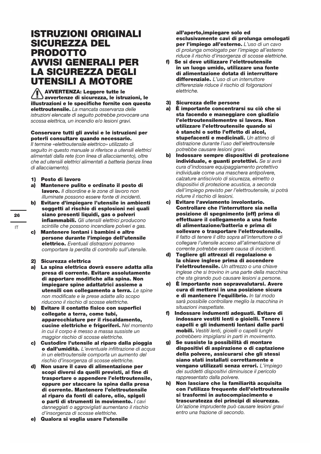 a) È importante concentrarsi su ciò che si sta facendo e maneggiare con giudizio l’elettroutensilementre si lavora. Non utilizzare l’elettroutensile quando si è stanchi o sotto l’effetto di alcol, stupefacenti e medicinali. Un attimo di distrazione durante l’uso dell’elettroutensile potrebbe causare lesioni gravi. b) Indossare sempre dispositivi di protezione individuale, e guanti protettivi. Se si avrà cura d’indossare equipaggiamento protettivo individuale come una maschera antipolvere, calzature antiscivolo di sicurezza, elmetto o dispositivi di protezione acustica, a seconda dell’impiego previsto per l’elettroutensile, si potrà ridurre il rischio di lesioni. c) Evitare l'avviamento involontario. Controllare che l’interruttore sia nella posizione di spegnimento (off) prima di effettuare il collegamento a una fonte di alimentazione/batteria e prima di sollevare o trasportare l’elettroutensile. Il fatto di tenere il dito sopra all’interruttore o di collegare l’utensile acceso all’alimentazione di corrente potrebbe essere causa di incidenti. d) Togliere gli attrezzi di regolazione o la chiave inglese prima di accendere l’elettroutensile. Un attrezzo o una chiave inglese che si trovino in una parte della macchina che sta girando può causare lesioni a persone. e) È importante non sopravvalutarsi. Avere cura di mettersi in una posizione sicura e di mantenere l’equilibrio. In tal modo sarà possibile controllare meglio la macchina in situazioni inaspettate. f) Indossare indumenti adeguati. Evitare di indossare vestiti lenti o gioielli. Tenere i capelli e gli indumenti lontani dalle parti mobili. Vestiti lenti, gioielli o capelli lunghi potrebbero impigliarsi in parti in movimento. g) Se sussiste la possibilità di montare dispositivi di aspirazione o di captazione della polvere, assicurarsi che gli stessi siano stati installati correttamente e vengano utilizzati senza errori. L’impiego dei suddetti dispositivi diminuisce il pericolo rappresentato dalla polvere. h) Non lasciare che la familiarità acquisita con l’utilizzo frequente dell'elettroutensile si trasformi in autocompiacimento e trascuratezza dei principi di sicurezza. Un’azione imprudente può causare lesioni gravi entro una frazione di secondo.27