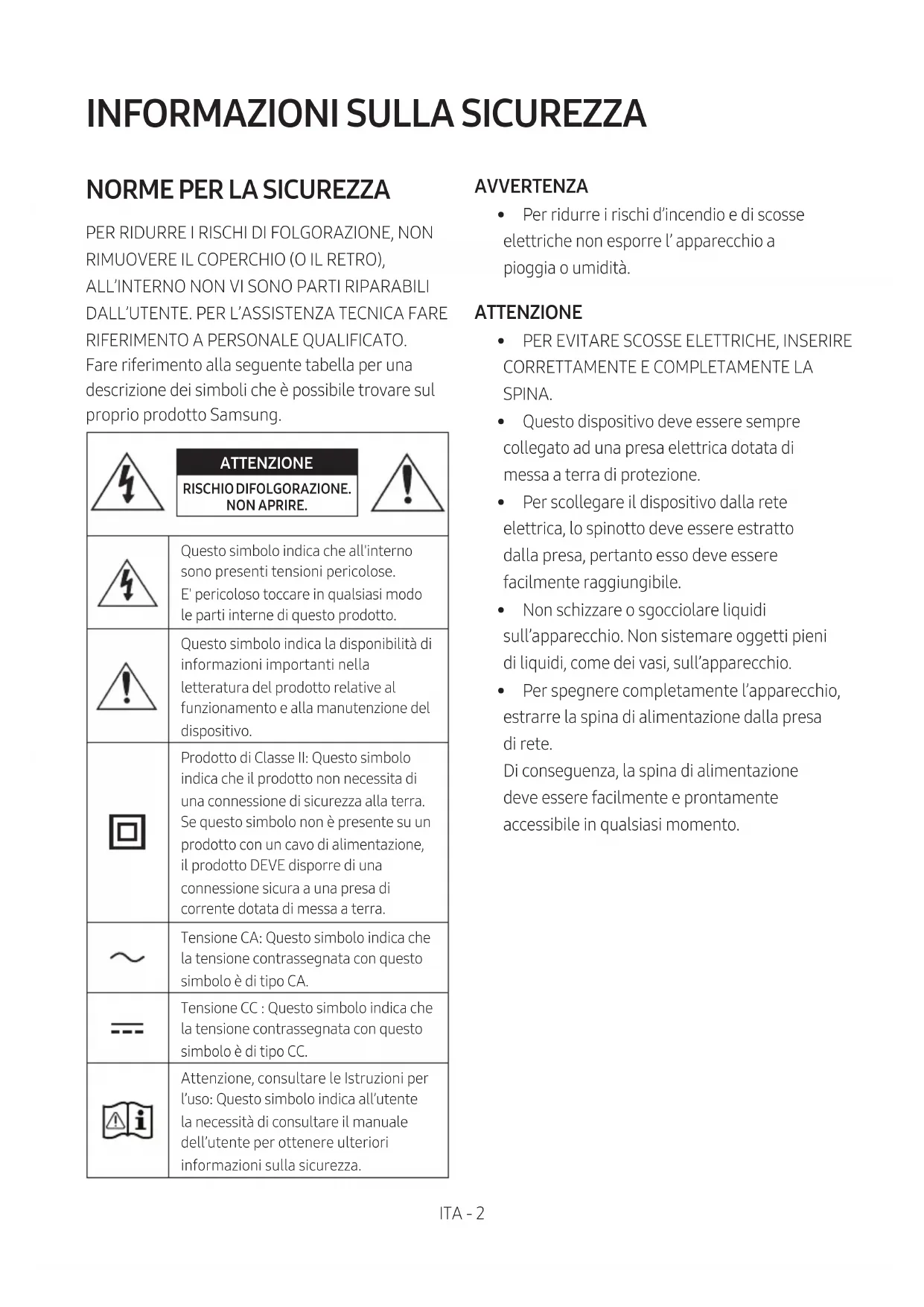 PER RIDURRE I RISCHI DI FOLGORAZIONE, NON RIMUOVERE IL COPERCHIO (O IL RETRO), ALL’INTERNO NON VI SONO PARTI RIPARABILI DALL’UTENTE. PER L’ASSISTENZA TECNICA FARE RIFERIMENTO A PERSONALE QUALIFICATO. Fare riferimento alla seguente tabella per una descrizione dei simboli che è possibile trovare sul proprio prodotto Samsung. ATTENZIONE RISCHIO DIFOLGORAZIONE. NON APRIRE.Questo simbolo indica che all'interno sono presenti tensioni pericolose. E' pericoloso toccare in qualsiasi modo le parti interne di questo prodotto.Questo simbolo indica la disponibilità di informazioni importanti nella letteratura del prodotto relative al funzionamento e alla manutenzione del dispositivo.Prodotto di Classe II: Questo simbolo indica che il prodotto non necessita di una connessione di sicurezza alla terra. Se questo simbolo non è presente su un prodotto con un cavo di alimentazione, il prodotto DEVE disporre di una connessione sicura a una presa di corrente dotata di messa a terra.Tensione CA: Questo simbolo indica che la tensione contrassegnata con questo simbolo è di tipo CA.Tensione CC : Questo simbolo indica che la tensione contrassegnata con questo simbolo è di tipo CC.Attenzione, consultare le Istruzioni per l’uso: Questo simbolo indica all’utente la necessità di consultare il manuale dell’utente per ottenere ulteriori informazioni sulla sicurezza. AVVERTENZA
