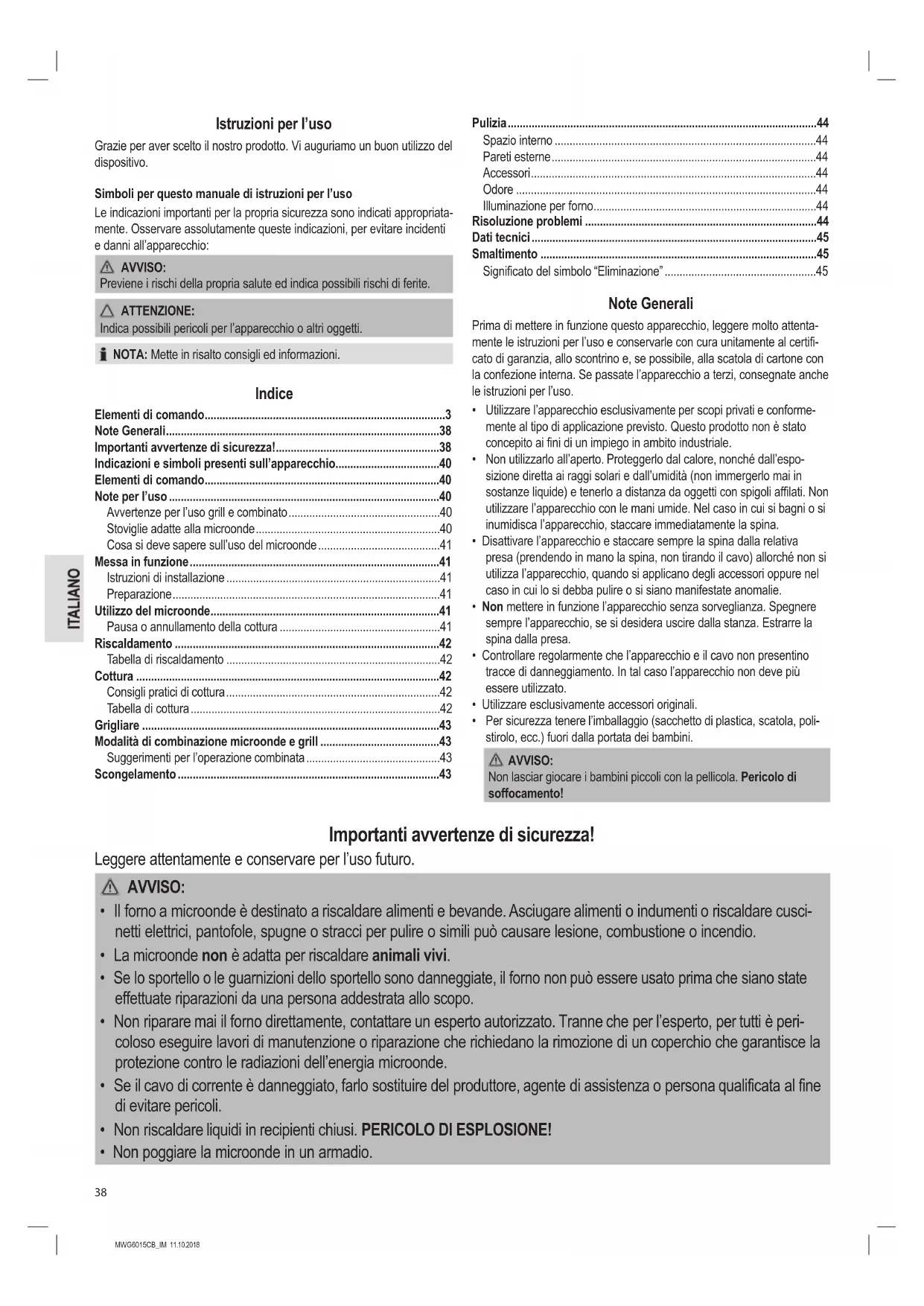 Dati tecnici Modello: .................................................................................MWG 6015 CB Alimentazione rete: ................................................................. 230 V~, 50 Hz Consumo di energia: Microonde: ..................................................................................... 1150 W Grill:................................................................................................. 800 W Potenza di uscita dimensionale della microonde: ............700 W / 2450 MHz Volume dello spazio di cottura: ......................................................ca. 20 litri Classe di protezione: ................................................................................... Peso netto: ....................................................................................ca. 11,4 kg Si riserva il diritto di apportare modifiche tecniche e di design nel corso dello sviluppo del prodotto. Questo apparecchio è stato controllato sulla base di tutte le direttive CE attuali in vigore in questo settore, quali per esempio la normativa in materia di compatibilità elettromagnetica e la direttiva in materia di bassa tensione, ed è stato costruito conformemente alle norme di sicurezza più moderne. Smaltimento Significato del simbolo “Eliminazione” Salvaguardare l’ambiente, gli elettrodomestici non vanno elimi- nati come rifiuti domestici. Per l’eliminazione degli elettrodomestici, fare uso dei posti di raccolta previsti per questo tipo e porre quegli elettrodomestici che non sono più in uso. Si contribuisce così ad evitare un effetto potenziale sull’ambiente e sulla salute, dovuto magari ad una eliminazione sbagliata. Questo significa un contributo personale alla riutilizzazione, al riciclaggio e altre forme di utilizzazione di elettrodomestici ed apparecchi elettronici usati. Si possono trovare le corrispondenti informazioni sugli appositi luoghi di raccolta, nelle amministrazioni dei comuni.46