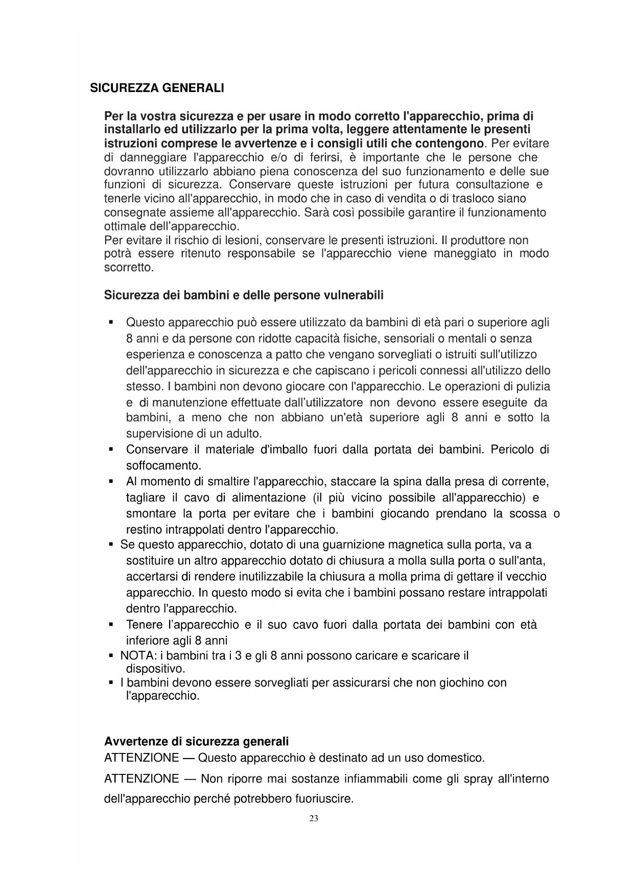 - Questo apparecchio può essere utilizzato da bambini di età pari o superiore agli 8 anni e da persone con ridotte capacità fisiche, sensoriali o mentali o senza esperienza e conoscenza a patto che vengano sorvegliati o istruiti sull'utilizzo dell'apparecchio in sicurezza e che capiscano i pericoli connessi all'utilizzo dello stesso. I bambini non devono giocare con l'apparecchio. Le operazioni di pulizia e di manutenzione effettuate dall’utilizzatore non devono essere eseguite da bambini, a meno che non abbiano un'età superiore agli 8 anni e sotto la supervisione di un adulto.