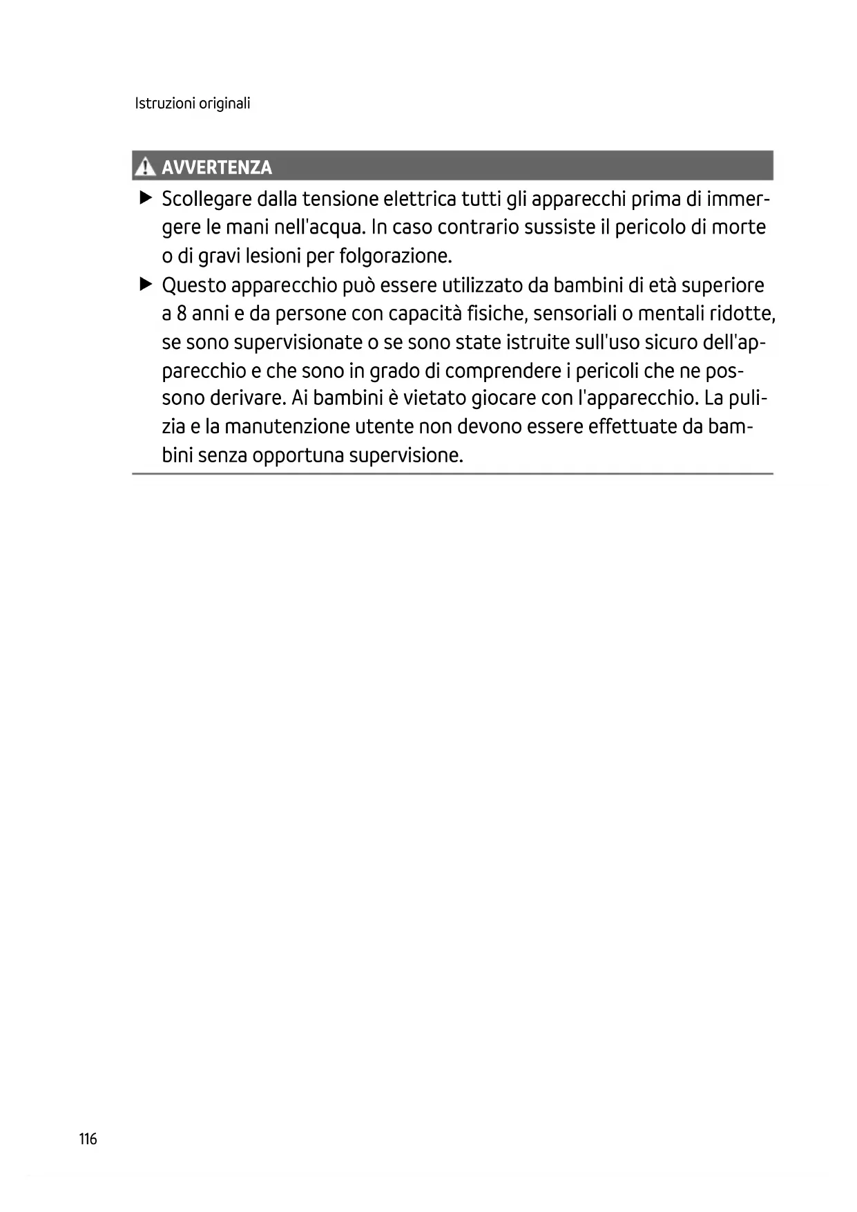 AVVI SO AVVERTENZA Scollegare dalla tensione elettrica tutti gli apparecchi prima di immer- gere le mani nell'acqua. In caso contrario sussiste il pericolo di morte o di gravi lesioni per folgorazione. Questo apparecchio può essere utilizzato da bambini di età superiore a 8 anni e da persone con capacità fisiche, sensoriali o mentali ridotte, se sono supervisionate o se sono state istruite sull'uso sicuro dell'ap- parecchio e che sono in grado di comprendere i pericoli che ne pos- sono derivare. Ai bambini è vietato giocare con l'apparecchio. La puli- zia e la manutenzione utente non devono essere effettuate da bam- bini senza opportuna supervisione.IT