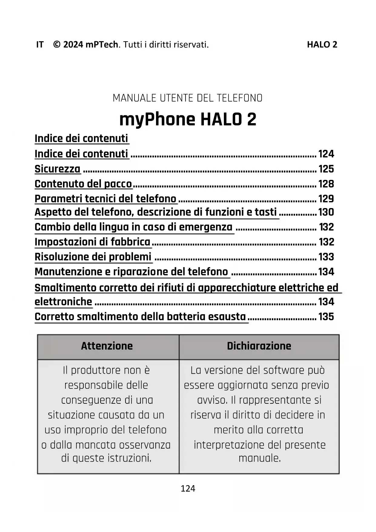 - Corretto smaltimento della batteria esausta Attenzione Dichiarazione Il produttore non è responsabile delle conseguenze di una situazione causata da un uso improprio del telefono o dalla mancata osservanza di queste istruzioni. La versione del software può essere aggiornata senza previo avviso. Il rappresentante si riserva il diritto di decidere in merito alla corretta interpretazione del presente manuale.IT © 2024 mPTech. Tutti i diritti riservati. HALO 2 p. 135