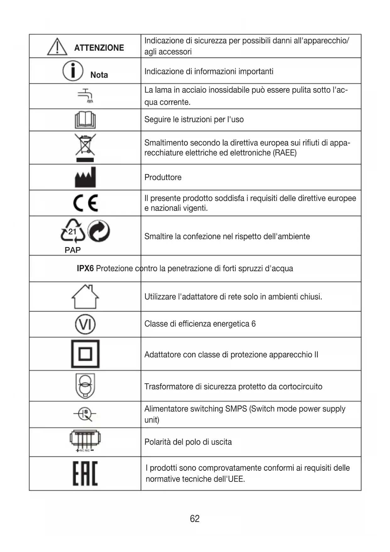 Smaltire la confezione nel rispetto dell'ambiente IPX6 Protezione contro la penetrazione di forti spruzzi d'acqua Utilizzare l'adattatore di rete solo in ambienti chiusi. Classe di ecienza energetica 6 Adattatore con classe di protezione apparecchio II Trasformatore di sicurezza protetto da cortocircuito Alimentatore switching SMPS (Switch mode power supply unit) Polarità del polo di uscita I prodotti sono comprovatamente conformi ai requisiti delle normative tecniche dell'UEE.62 63