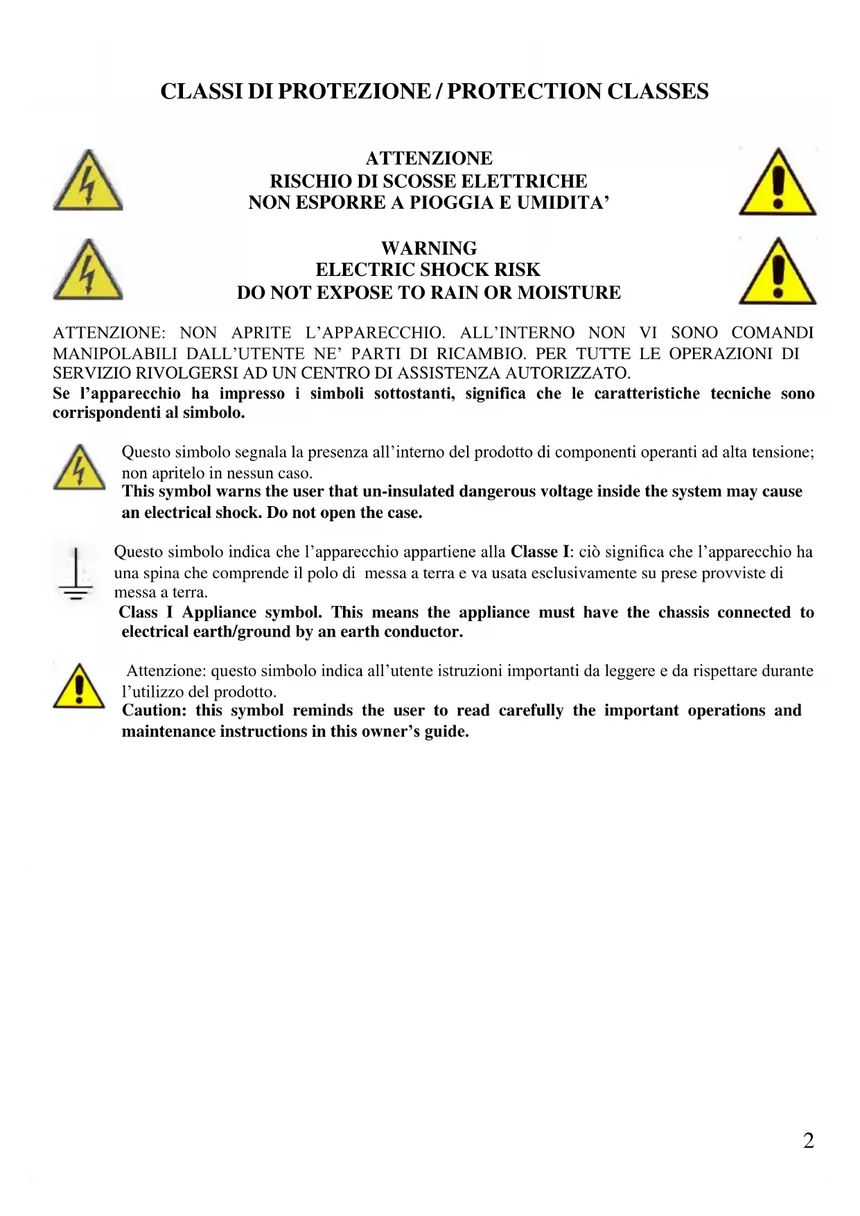 DO NOT EXPOSE TO RAIN OR MOISTURE ATTENZIONE: NON APRITE L’APPARECCHIO. ALL’INTERNO NON VI SONO COMANDI MANIPOLABILI DALL’UTENTE NE’ PARTI DI RICAMBIO. PER TUTTE LE OPERAZIONI DI SERVIZIO RIVOLGERSI AD UN CENTRO DI ASSISTENZA AUTORIZZATO. Se l’apparecchio ha impresso i simboli sottostanti, significa che le caratteristiche tecniche sono corrispondenti al simbolo. Questo simbolo segnala la presenza all’interno del prodotto di componenti operanti ad alta tensione; non apritelo in nessun caso. This symbol warns the user that un-insulated dangerous voltage inside the system may cause an electrical shock. Do not open the case. Questo simbolo indica che l’apparecchio appartiene alla Classe I: ciò significa che l’apparecchio ha una spina che comprende il polo di messa a terra e va usata esclusivamente su prese provviste di messa a terra. Class I Appliance symbol. This means the appliance must have the chassis connected to electrical earth/ground by an earth conductor. Attenzione: questo simbolo indica all’utente istruzioni importanti da leggere e da rispettare durante l’utilizzo del prodotto. Caution: this symbol reminds the user to read carefully the important operations and maintenance instructions in this owner’s guide.3