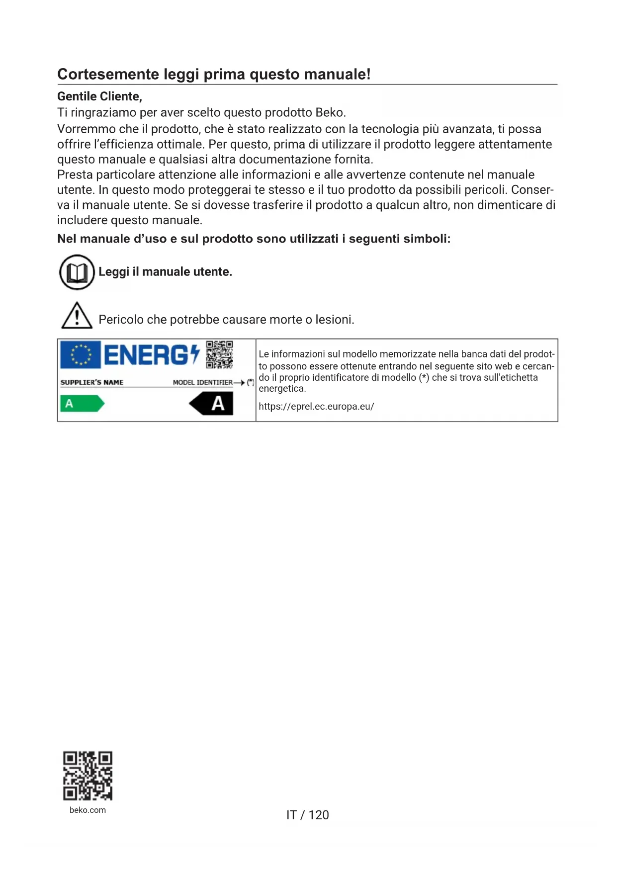 SVIT / 120 Cortesemente leggi prima questo manuale! Gentile Cliente, Ti ringraziamo per aver scelto questo prodotto Beko. Vorremmo che il prodotto, che è stato realizzato con la tecnologia più avanzata, ti possa offrire l’efficienza ottimale. Per questo, prima di utilizzare il prodotto leggere attentamente questo manuale e qualsiasi altra documentazione fornita. Presta particolare attenzione alle informazioni e alle avvertenze contenute nel manuale utente. In questo modo proteggerai te stesso e il tuo prodotto da possibili pericoli. Conser- va il manuale utente. Se si dovesse trasferire il prodotto a qualcun altro, non dimenticare di includere questo manuale. Nel manuale d’uso e sul prodotto sono utilizzati i seguenti simboli: Leggi il manuale utente. Pericolo che potrebbe causare morte o lesioni. Le informazioni sul modello memorizzate nella banca dati del prodot- to possono essere ottenute entrando nel seguente sito web e cercan- do il proprio identificatore di modello (*) che si trova sull'etichetta energetica. https://eprel.ec.europa.eu/ beko.comIT / 121 Indice 1 Istruzioni di sicurezza .................... 122