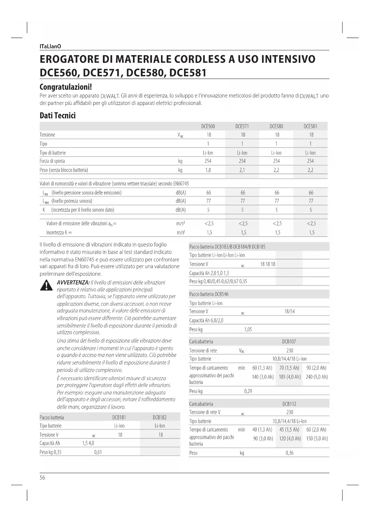 Congratulazioni! Per aver scelto un apparato DeWALT . Gli anni di esperienza, lo sviluppo e l’innovazione meticolosi del prodotto fanno di DeWALT uno dei partner più affidabili per gli utilizzatori di apparati elettriciprofessionali. Dati Tecnici