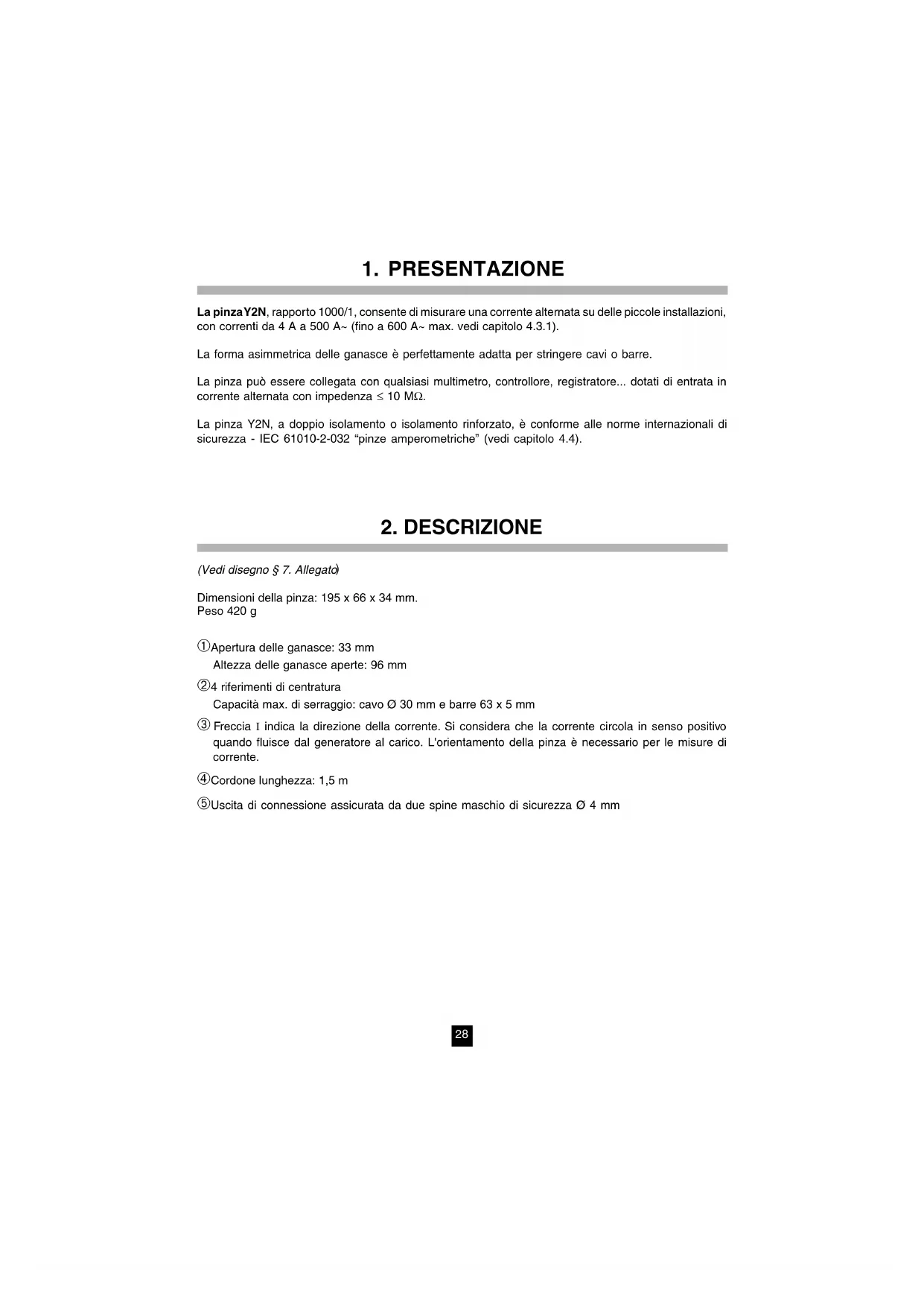 Dimensioni della pinza: 195 x 66 x 34 mm. Peso 420 g ➀ Apertura delle ganasce: 33 mm Altezza delle ganasce aperte: 96 mm ➁ 4 riferimenti di centratura Capacità max. di serraggio: cavo Ø 30 mm e barre 63 x 5 mm ➂ Freccia I indica la direzione della corrente. Si considera che la corrente circola in senso positivo quando fluisce dal generatore al carico. L'orientamento della pinza è necessario per le misure di corrente. ➃ Cordone lunghezza: 1,5 m ➄ Uscita di connessione assicurata da due spine maschio di sicurezza Ø 4 mm29