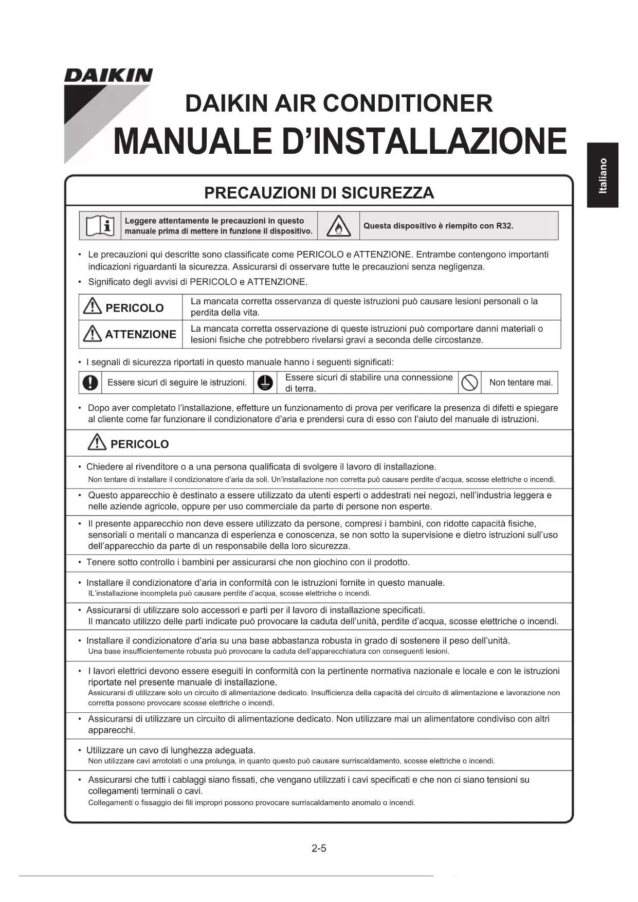 Leggere attentamente le precauzioni in questomanuale prima di mettere in funzione il dispositivo.Questa dispositivo è riempito con R32.