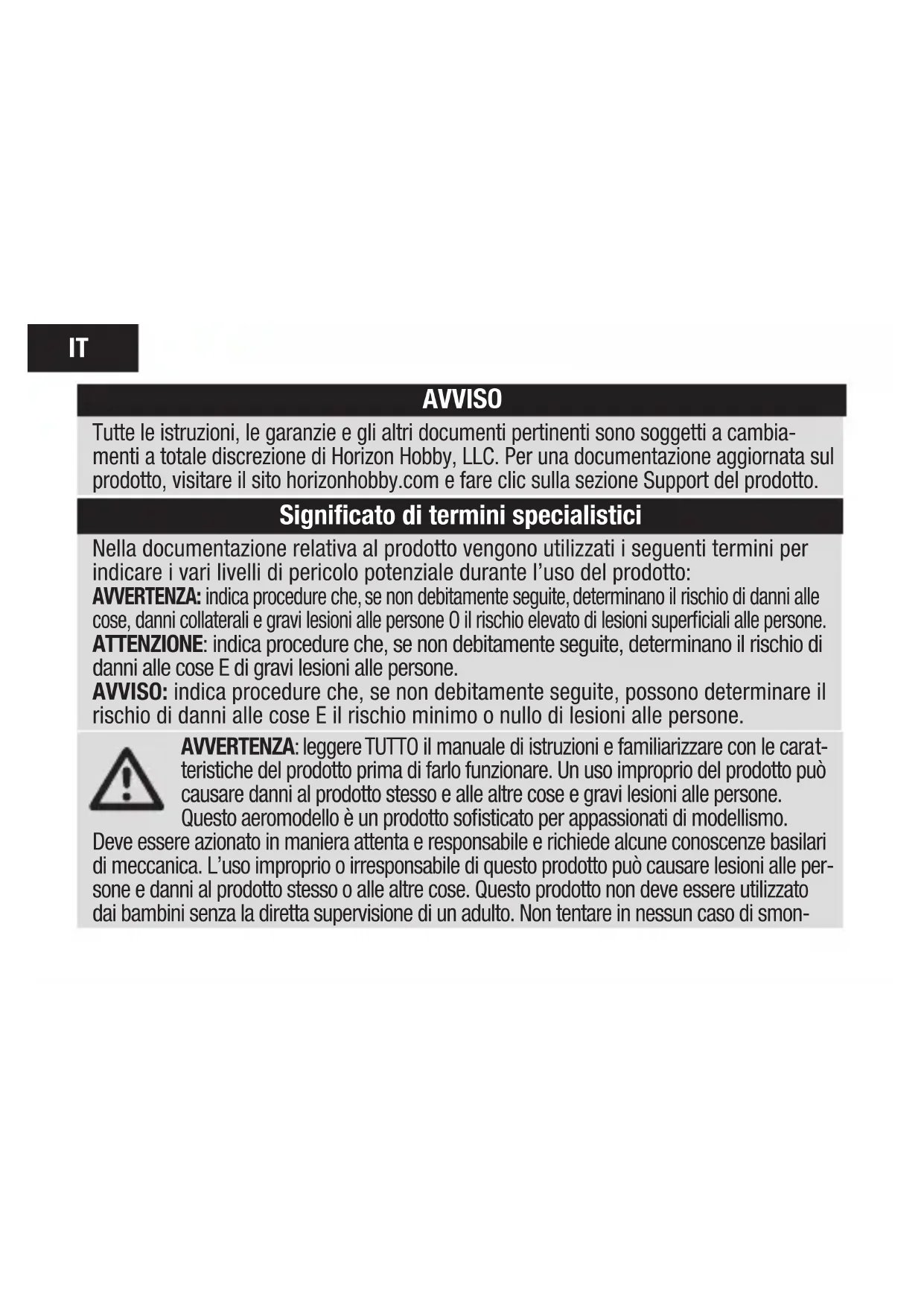 - Interrompere sempre qualsiasi processo e rivolgersi a Horizon Hobby se il prodotto funziona male. AVVERTIMENTO: Non lasciare mai incustodito il caricabatterie, non superare la corrente di carica massima, non effettuare la carica di batterie non approvate o caricare le batterie in modo sbagliato. Il mancato rispetto di queste disposizioni può comportare un calore eccessivo, incendi e lesioni gravi. ATTENZIONE: verificare sempre che la batteria sotto carica soddisfi le specifiche di questo caricabatterie e che le impostazioni del caricabatterie siano corrette. Non farlo potrebbe portare a un eccessivo calore e ad altre disfunzioni del prodotto, che potrebbero portare a lesioni per l’utente o a danni alla proprietà. Rivolgersi a Horizon Hobby o a un rivenditore autorizzato per domande sulla compatibilità.IT