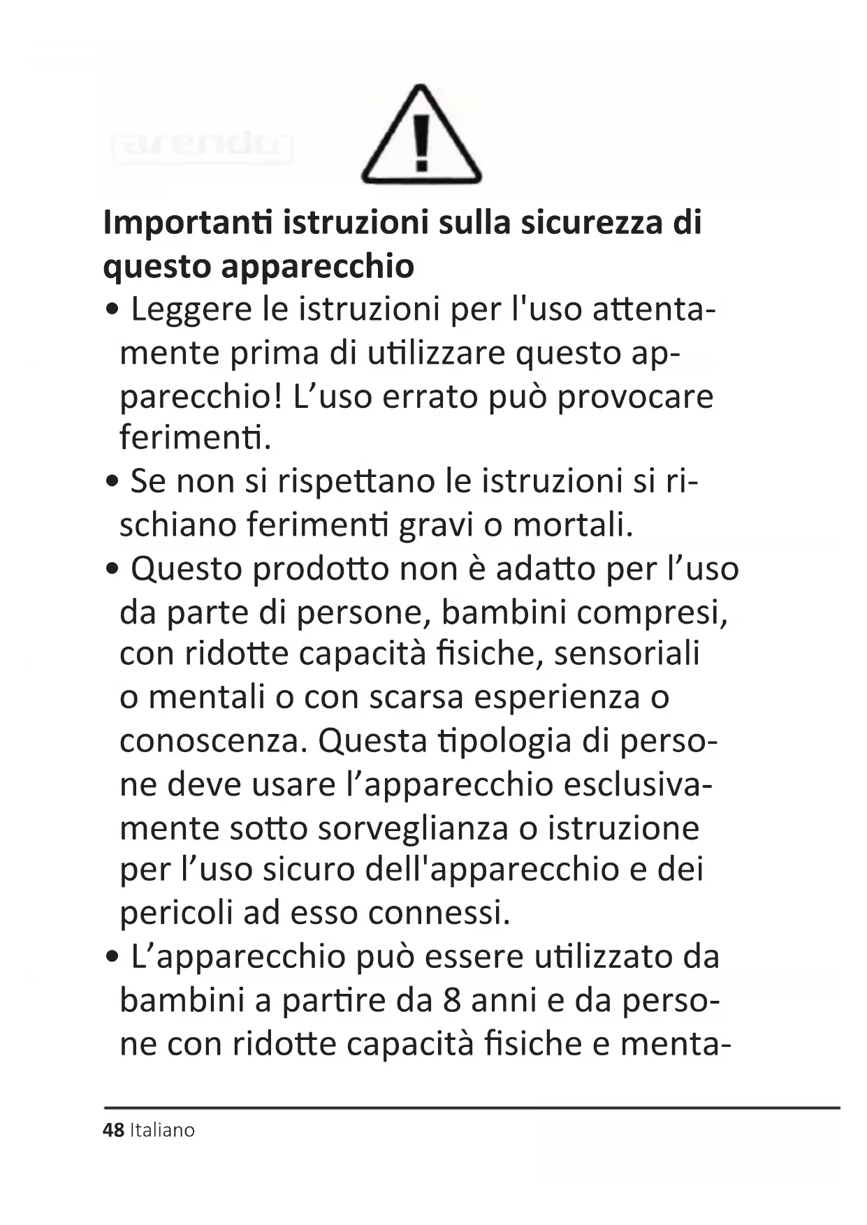 - Questo prodoo non è adao per l’uso da parte di persone, bambini compresi, con ridoe capacità siche, sensoriali o mentali o con scarsa esperienza o conoscenza. Questa pologia di perso- ne deve usare l’apparecchio esclusiva- mente soo sorveglianza o istruzione per l’uso sicuro dell'apparecchio e dei pericoli ad esso connessi.