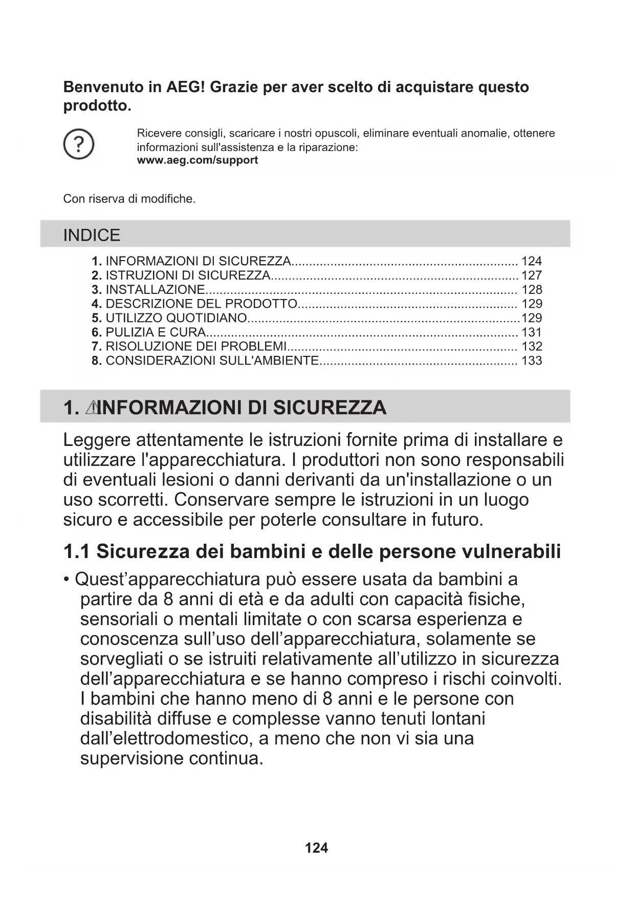 - Quest’apparecchiatura può essere usata da bambini a partire da 8 anni di età e da adulti con capacità fisiche, sensoriali o mentali limitate o con scarsa esperienza e conoscenza sull’uso dell’apparecchiatura, solamente se sorvegliati o se istruiti relativamente all’utilizzo in sicurezza dell’apparecchiatura e se hanno compreso i rischi coinvolti. I bambini che hanno meno di 8 anni e le persone con disabilità diffuse e complesse vanno tenuti lontani dall’elettrodomestico, a meno che non vi sia una supervisione continua. 124• Controllare che i bambini non giochino con l’apparecchiatura.