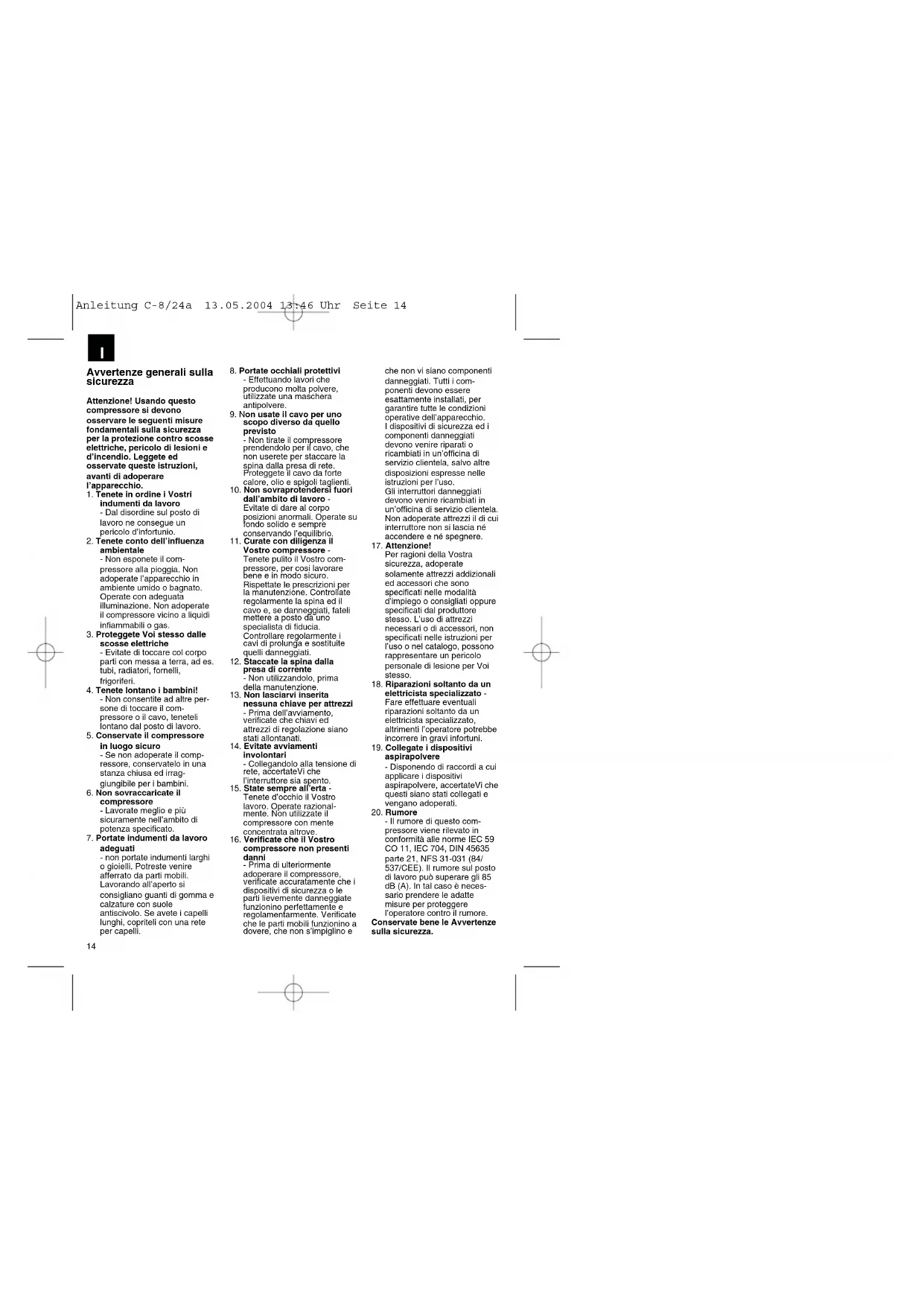 Anleitung C-8/24a 13.05.2004 13:46 Uhr Seite 1314 Avvertenze generali sulla sicurezza Attenzione! Usando questo compressore si devono osservare le seguenti misure fondamentali sulla sicurezza per la protezione contro scosse elettriche, pericolo di lesioni e d’incendio. Leggete ed osservate queste istruzioni, avanti di adoperare l’apparecchio.