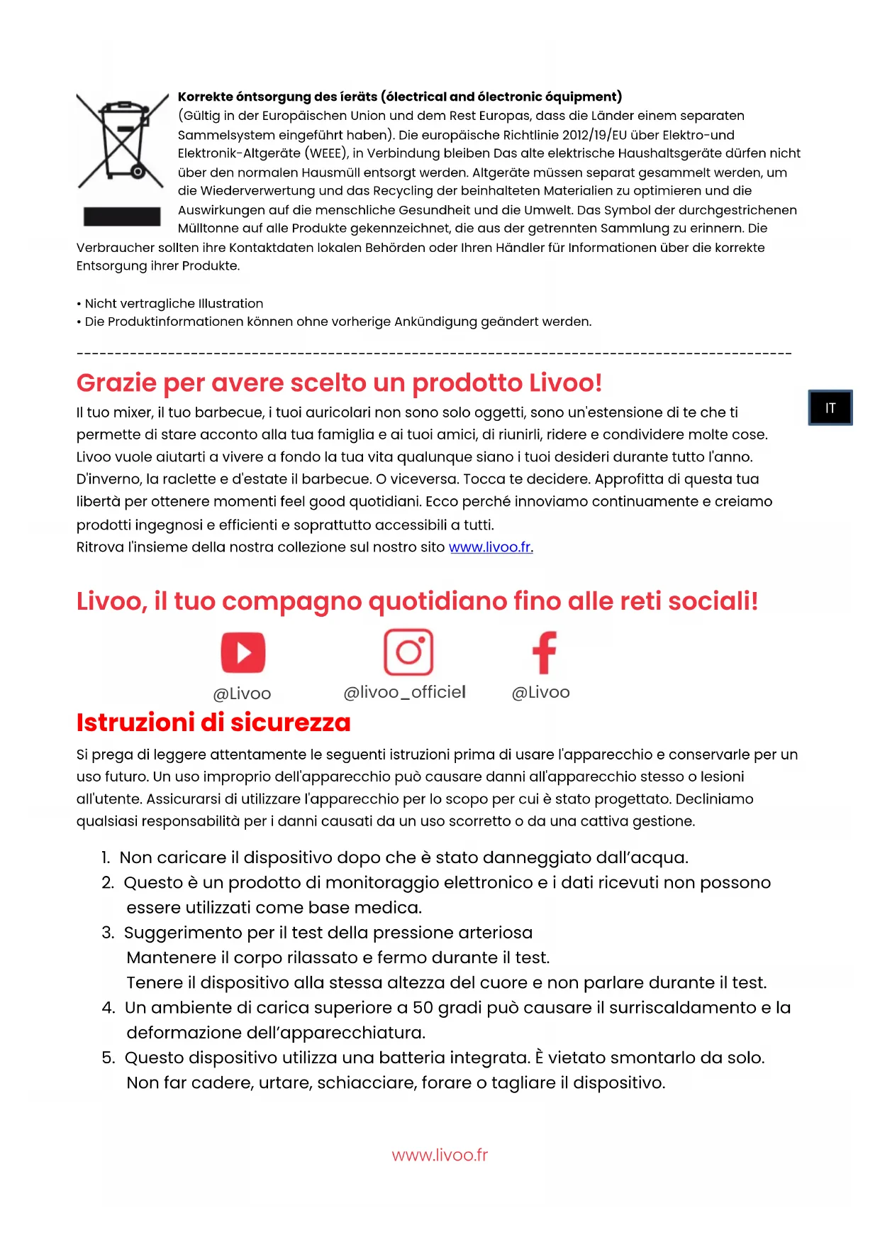Grazie per avere scelto un prodotto Livoo! Il tuo mixer, il tuo barbecue, i tuoi auricolari non sono solo oggetti, sono un'estensione di te che ti permette di stare acconto alla tua famiglia e ai tuoi amici, di riunirli, ridere e condividere molte cose. Livoo vuole aiutarti a vivere a fondo la tua vita qualunque siano i tuoi desideri durante tutto l'anno. D'inverno, la raclette e d'estate il barbecue. O viceversa. Tocca te decidere. Approfitta di questa tua libertà per ottenere momenti feel good quotidiani. Ecco perché innoviamo continuamente e creiamo prodotti ingegnosi e efficienti e soprattutto accessibili a tutti. Ritrova l'insieme della nostra collezione sul nostro sito www.livoo.fr. Livoo, il tuo compagno quotidiano fino alle reti sociali!