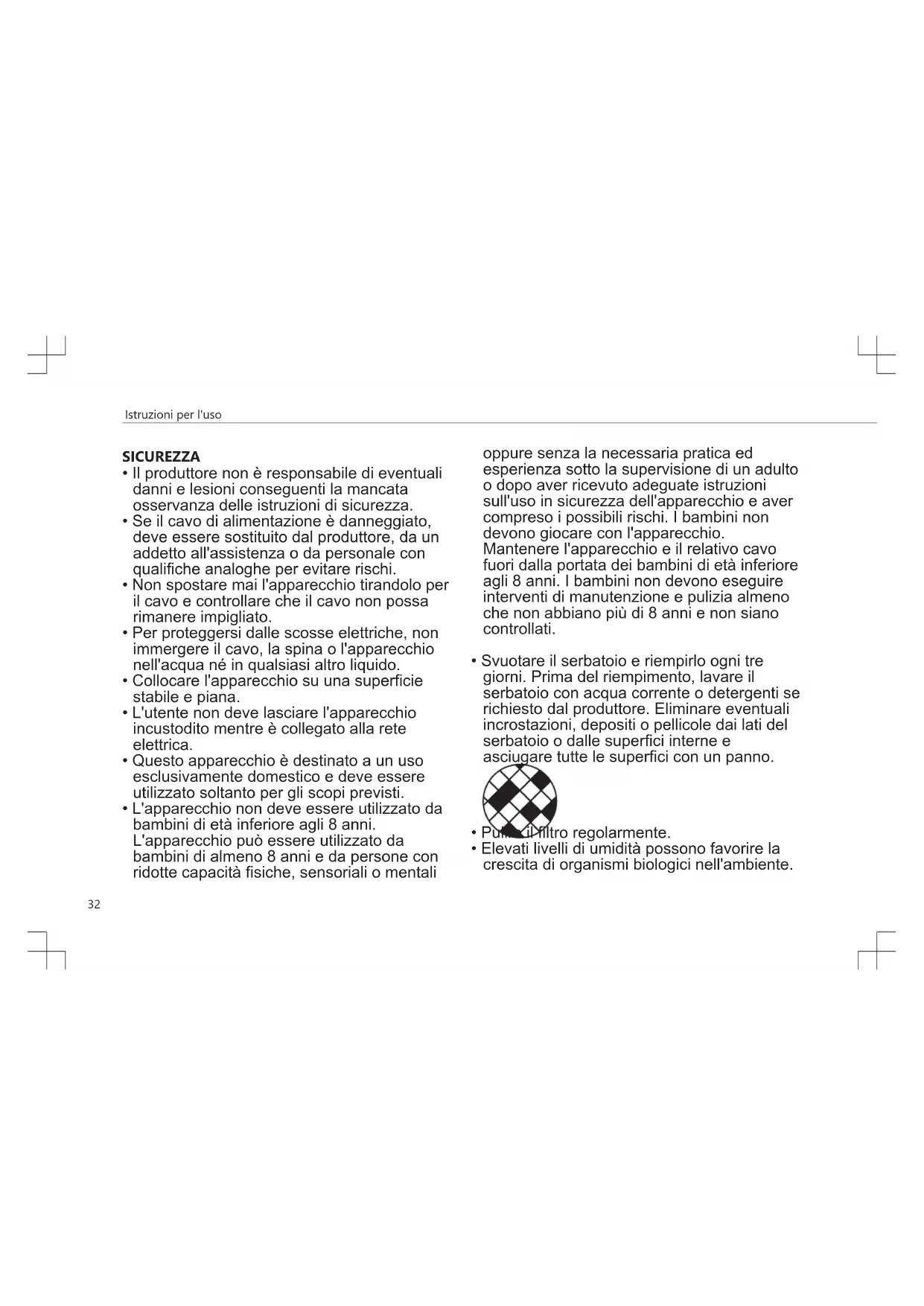 - AVVERTENZA: Se l'acqua nel serbatoio non viene rinnovata e il serbatoio non viene pulito con regolarità e nel modo corretto, i microrganismi possono proliferare nell'acqua del serbatoio ed essere dispersi nell'aria causando seri rischi per la salute. I rifiuti elettrici non vanno smaltiti insieme ai rifiuti domestici. Provvedere al riciclo dove esistono strutture. Effettuare la verifica presso l'autorità locale o il negozio in loco per ottenere consigli sul riciclaggio. Questo prodotto è conforme alle prescrizioni applicabili contenute nelle normative o direttive europee. The Green Dot è un marchio registrato di Der Grüne Punkt – Duales System Deutschland GmbH ed è protetto come marchio in tutto il mondo. Il logo può essere utilizzato unicamente dai clienti di DSD GmbH titolari di un valido contratto di utilizzo del marchio o da società di gestione dei rifiuti impegnate all'interno della Repubblica Federale di Germania. Quanto sopra si applica anche alla riproduzione del logo da parte di terzi in un dizionario, un'enciclopedia o una banca dati elettronica contenente un manuale di riferimento. Il prodotto e i materiali di imballaggio sono riciclabili, a condizione che la responsabilità del produttore sia estesa. Smaltirli separatamente, seguendo i simboli di imballaggio illustrati, per un ottimale trattamento dei rifiuti. Il logo Triman è valido solo in Francia. Un elettrodomestico di Classe III è progettato per essere alimentato da una fonte di alimentazione separata a bassissima tensione. La tensione di un alimentatore SELV è così bassa che, in condizioni normali, una persona può entrarvi in contatto senza rischiare scosse elettriche. Non sono quindi necessarie le caratteristiche di sicurezza aggiuntive previste per gli apparecchi di Classe I e II. In particolare, gli elettrodomestici di classe III sono progettati senza conduttore di terra e non devono essere collegati ITIstruzioni per l'uso